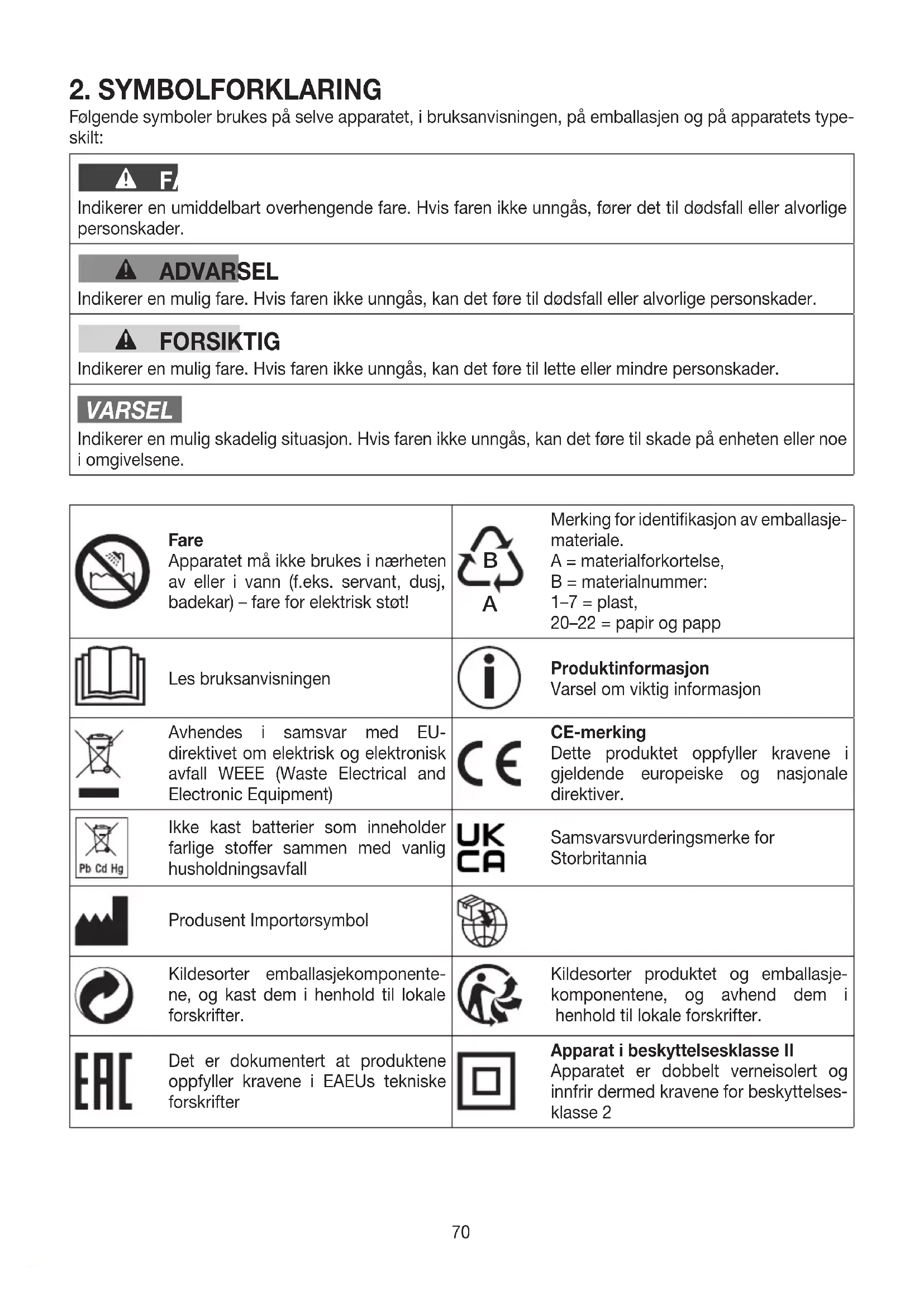 Følgende symboler brukes på selve apparatet, i bruksanvisningen, på emballasjen og på apparatets type- skilt: FARE Indikerer en umiddelbart overhengende fare Hvis faren ikke unngås, fører det til dødsfall eller alvorlige personskader ADVARSEL Indikerer en mulig fare Hvis faren ikke unngås, kan det føre til dødsfall eller alvorlige personskader FORSIKTIG Indikerer en mulig fare Hvis faren ikke unngås, kan det føre til lette eller mindre personskader VARSEL Indikerer en mulig skadelig situasjon Hvis faren ikke unngås, kan det føre til skade på enheten eller noe i omgivelsene Fare Apparatet må ikke brukes i nærheten av eller i vann (feks servant, dusj, badekar) – fare for elektrisk støt!
