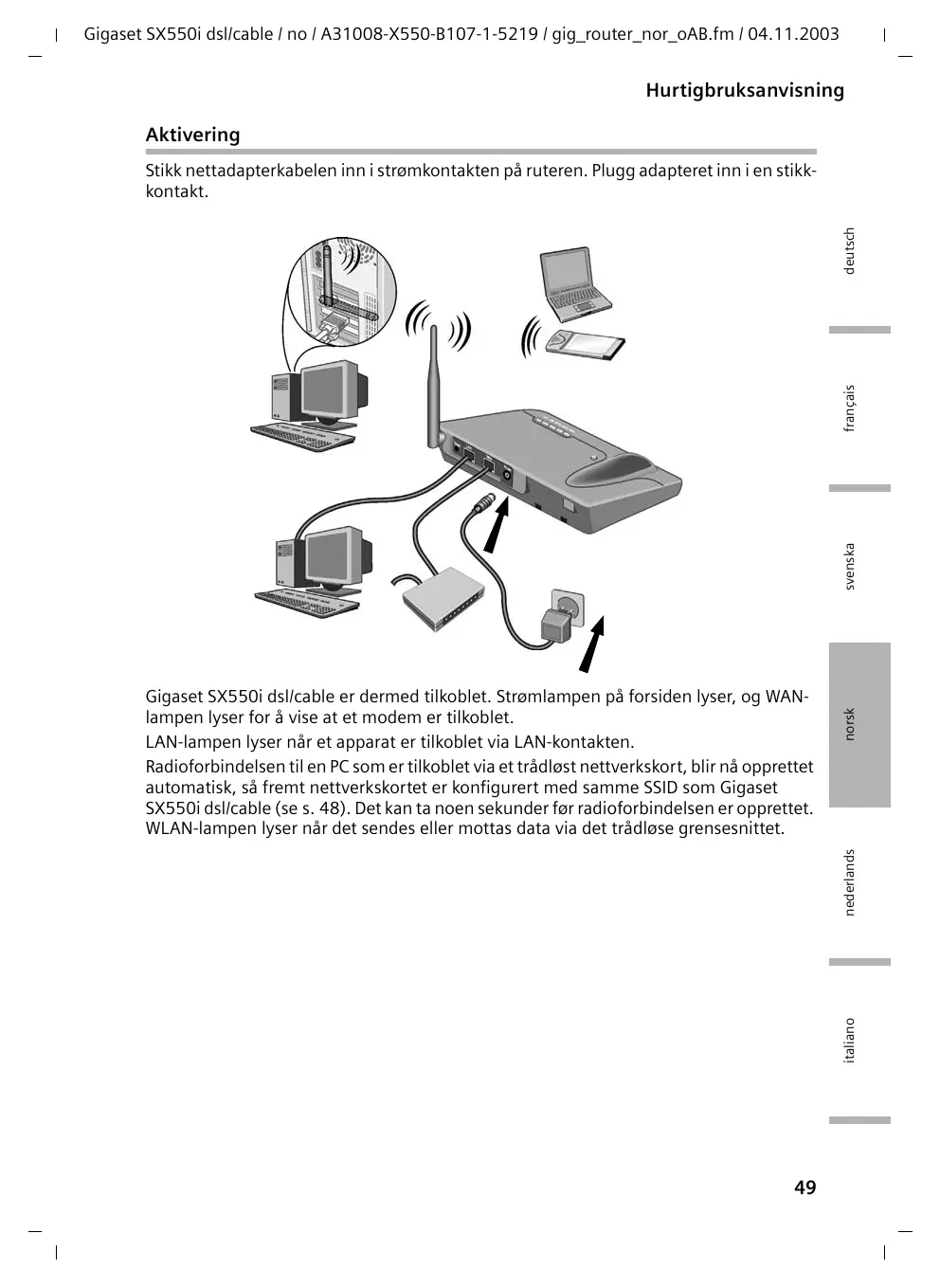 Gigaset SX550i dsl/cable / no / A31008-X550-B107-1-5219 / gig_router_nor_oAB.fm / 04.11.2003 Hurtigbruksanvisning Denne hurtigbruksanvisningen viser deg hvordan du oppretter, kobler deg til og, konfigurerer en Internett-forbindelse for din Gigaset SX550i dsl/cable. Detaljerte opplysninger om apparatets mange muligheter er tilgjengelig i elektronisk form på den vedlagte CD-ROM-platen og på Internett under www.my-siemens.no/SX550I. deutsch Hurtigbruksanvisning Microsoft, Windows 98, Windows 98 SE, Windows ME, Windows 2000, Windows XP og Internet Explorer er registrerte varemerker som tilhører Microsoft Corporation. Netscape, Netscape Navigator og Netscape Communicator er registrerte varemerker som tilhører Netscape Communications Corporation. Sikkerhetsanvisninger français Varemerker ◆ Bruk bare det medfølgende nettadapteret. Ikke overskrid tilkoblingsverdiene ved til- vicepersonell. ◆ Apparatet kan påvirke driften av medisinsk utstyr. Ta hensyn til de tekniske forhol- svenska kobling til strømnettet. ◆ Beskytt apparatet mot fuktighet. ◆ Apparatet må ikke åpnes. Av sikkerhetsårsaker skal det bare åpnes av autorisert ser- dene i de aktuelle omgivelsene. italiano Pakken inneholder følgende deler: ◆ Gigaset SX550i dsl/cable ◆ et håndsett med tilbehør ◆ et nettadapter ◆ en ISDN-tilkoblingskabel for telefon ◆ en Ethernet-tilkoblingskabel for DSL/Ethernet ◆ en installasjons-CD som også inneholder bruksanvisning og dokumentet «Practical Tips and Configuration Examples» for apparatets innebygde ruter ◆ bruksanvisning for håndsettet ◆ denne hurtigbruksanvisningen nederlands Pakningsinnhold norsk ◆ Bruksanvisningen skal følge med hvis du overdrar apparatet til en annen person. ◆ Kassering av apparatet bør skje på en miljøvennlig måte.