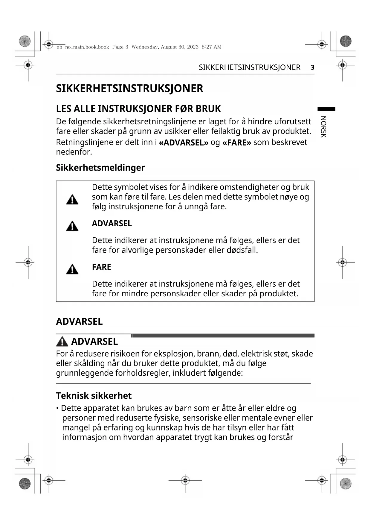 - Dette apparatet kan brukes av barn som er åtte år eller eldre og personer med reduserte fysiske, sensoriske eller mentale evner eller mangel på erfaring og kunnskap hvis de har tilsyn eller har fått informasjon om hvordan apparatet trygt kan brukes og forstår Dette symbolet vises for å indikere omstendigheter og bruk som kan føre til fare. Les delen med dette symbolet nøye og følg instruksjonene for å unngå fare. ADVARSEL Dette indikerer at instruksjonene må følges, ellers er det fare for alvorlige personskader eller dødsfall. FARE Dette indikerer at instruksjonene må følges, ellers er det fare for mindre personskader eller skader på produktet. nb-no_main.book.book Page 3 Wednesday, August 30, 2023 8:27 AM4 SIKKERHETSINSTRUKSJONER farene dette medfører. Barn må ikke leke med apparatet. Rengjøring og vedlikehold bør ikke utføres av barn uten tilsyn.