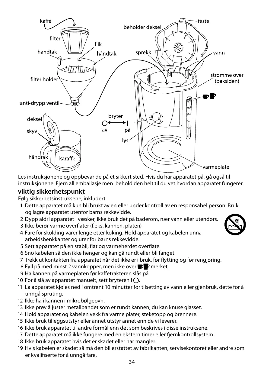 2 N’immergez pas l’appareil dans un liquide, ne l’utilisez pas dans une salle de bains, à proximité d’une source d’eau ou à l’extérieur. 3 Ne touchez pas les surfaces chaudes ( la carafe, la plaque chauffante). 4 Le risque de brûlure persiste longtemps après ébullition. Tenez l’appareil et le câble loin des bords des surfaces de travail et hors de portée des enfants. 5 Posez l’appareil sur une surface stable, à niveau et résistante à la chaleur. 6 Branchez le cordon de sorte qu’il ne pende pas et qu’il n’y ait aucun risque de trébucher dessus. 7 Débranchez l’appareil lorsque vous ne l’utilisez pas, avant de le déplacer et avant de le nettoyer. 8 Remplissez le réservoir avec 2 tasses au minimum, mais sans dépasser la marque ;:. 9 Placez la carafe sur la plaque chauffante avant d’allumer la cafetière. 10 Si vous voulez arrêter la machine pendant la préparation du café, mettez l’interrupteur sur 0. 11 Laissez l’appareil refroidir au moins 10 minutes avant de rajouter de l’eau ou de le réutiliser afin d’éviter toute projection. 12 Ne mettez pas la carafe au four micro-ondes. 13 N’essayez pas de régler la bande métallique autour de la carafe, le verre casserait. 14 Placez l’appareil et le cordon loin des plaques chauffantes, des plans de cuisson ou des brûleurs. 15 N’adaptez pas d’accessoires autres que ceux fournis. 6
