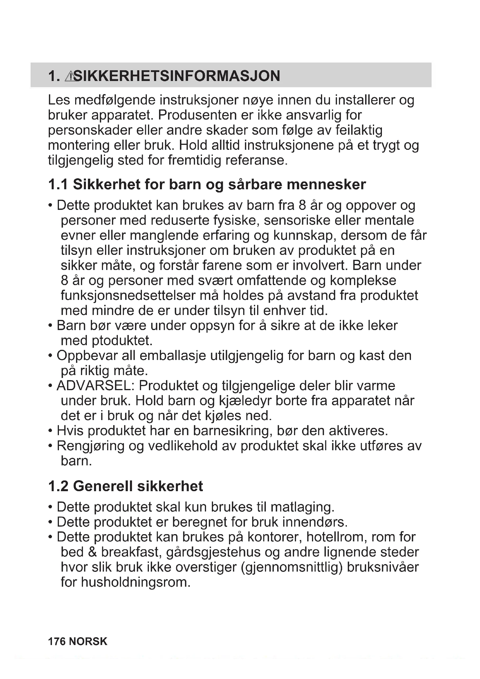 NORSK 1751. SIKKERHETSINFORMASJON Les medfølgende instruksjoner nøye innen du installerer og bruker apparatet. Produsenten er ikke ansvarlig for personskader eller andre skader som følge av feilaktig montering eller bruk. Hold alltid instruksjonene på et trygt og tilgjengelig sted for fremtidig referanse.