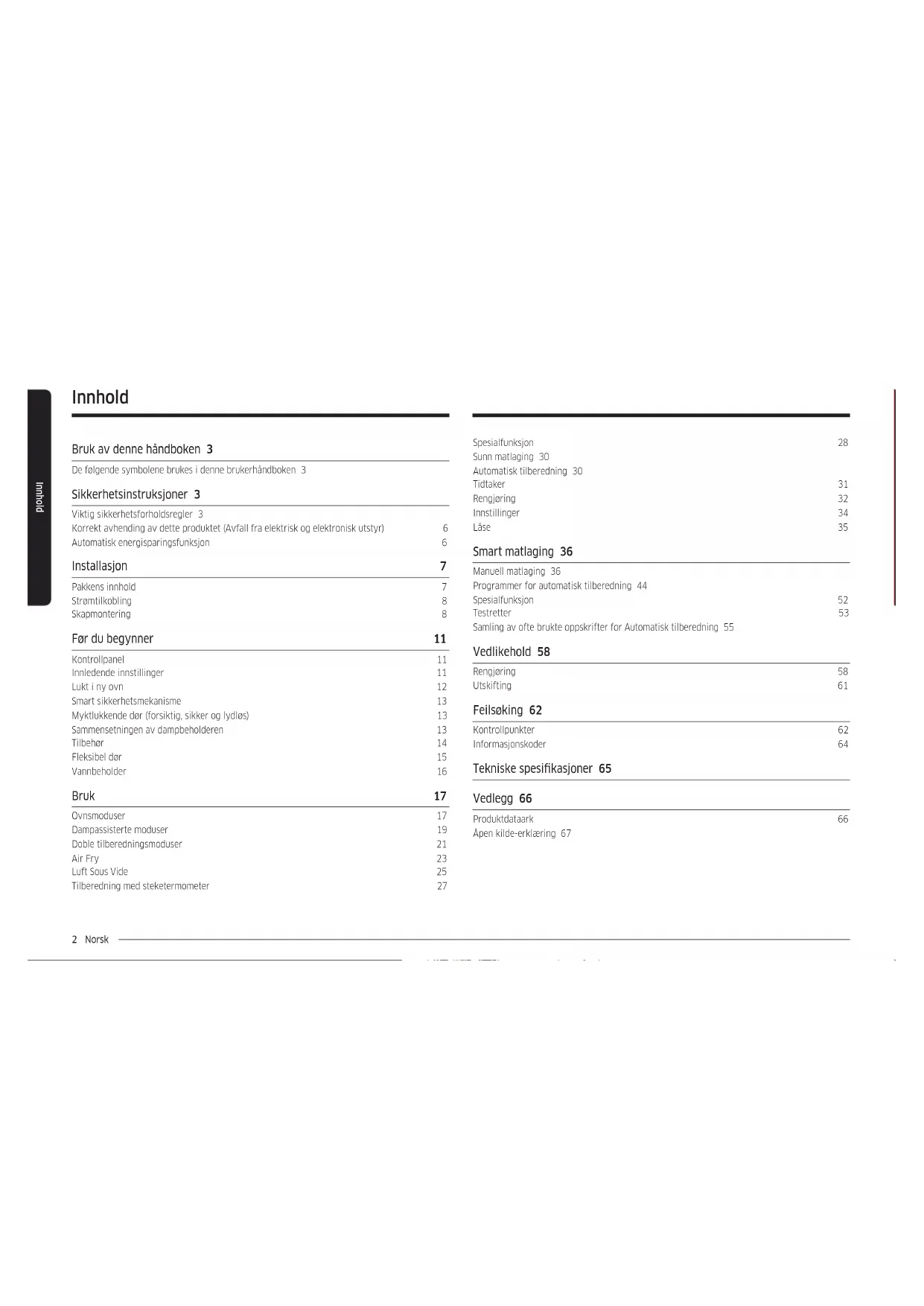 Chamada para a rede xa nacional Dias úteis das 9h às 20h www.samsung.com/pt/support SPAIN 91 175 00 15 www.samsung.com/es/support SWEDEN 0771-400 300 www.samsung.com/se/support SWITZERLAND 0800 726 786 www.samsung.com/ch/support (German) www.samsung.com/ch_fr/support (French) UK 0333 000 0333 www.samsung.com/uk/support IRELAND (EIRE) 0818 717100 www.samsung.com/ie/support DG68-01411A-04Innebygget ovn Bruker- og installasjonshåndbok NV7B666**** / NV7B667**** / NV7B668**** / NV7B669**** / NV7B676**** / NV7B677**** / NV7B678**** / NV7B679**** / NV7B666**C* / NV7B668**C*2 Norsk Innhold Spesialfunksjon 28 Sunn matlaging 30 Automatisk tilberedning 30 Tidtaker 31 Rengjøring 32 Innstillinger 34 Låse 35 Smart matlaging 36 Manuell matlaging 36 Programmer for automatisk tilberedning 44 Spesialfunksjon 52 Testretter 53 Samling av ofte brukte oppskrifter for Automatisk tilberedning 55 Vedlikehold 58 Rengjøring 58 Utskifting 61 Feilsøking 62 Kontrollpunkter 62 Informasjonskoder 64 Tekniske spesikasjoner 65 Vedlegg 66 Produktdataark 66 Åpen kilde-erklæring 67 Innhold Bruk av denne håndboken 3 De følgende symbolene brukes i denne brukerhåndboken 3 Sikkerhetsinstruksjoner 3 Viktig sikkerhetsforholdsregler 3 Korrekt avhending av dette produktet (Avfall fra elektrisk og elektronisk utstyr) 6 Automatisk energisparingsfunksjon 6 Installasjon 7 Pakkens innhold 7 Strømtilkobling 8 Skapmontering 8 Før du begynner 11 Kontrollpanel 11 Innledende innstillinger 11 Lukt i ny ovn 12 Smart sikkerhetsmekanisme 13 Myktlukkende dør (forsiktig, sikker og lydløs) 13 Sammensetningen av dampbeholderen 13 Tilbehør 14 Fleksibel dør 15 Vannbeholder 16 Bruk 17 Ovnsmoduser 17 Dampassisterte moduser 19 Doble tilberedningsmoduser 21 Air Fry 23 Luft Sous Vide 25 Tilberedning med steketermometer 27Norsk 3 Bruk av denne håndboken Sikkerhetsinstruksjoner Installasjon av denne ovnen må utføres av en autorisert elektriker. Installatøren er ansvarlig for tilkobling av apparatet til strømnettet i henhold til aktuelle sikkerhetsanbefalinger. VIKTIG SIKKERHETSFORHOLDSREGLER ADVARSEL Dette apparatet skal ikke brukes av personer (inkludert barn) med svekkede fysiske, sensoriske eller mentale evner eller av personer som mangler relevant erfaring og kunnskap, med mindre de er under oppsyn eller får instruksjoner av en person som er ansvarlig for deres sikkerhet. Barn må være under oppsyn for å sikre at de ikke leker med apparatet. Innretningen for frakobling må være innlemmet i den faste kablingen i henhold til kablingsregler. Det må være mulig å koble apparatet fra strømforsyningen etter installasjonen. Frakoblingen kan oppnås ved å ha støpselet tilgjengelig eller ved å legge inn en bryter i kablingen i samsvar med kablingsreglene. Hvis strømledningen blir skadet, må den byttes ut av produsenten, produsentens serviceagent eller en annen kvalisert person for å unngå farer. Bruk av denne håndboken Takk for at du valgte en SAMSUNG innebygget ovn. Denne brukerhåndboken inneholder viktig informasjon om sikkerhet og instruksjoner som er ment som hjelp ved bruk og vedlikehold av apparatet ditt. Ta deg tid til å lese denne brukerhåndboken før du bruker ovnen og ta vare på denne boken for fremtidig referanse. De følgende symbolene brukes i denne brukerhåndboken ADVARSEL Fare eller usikker bruk som kan medføre alvorlige personskader, død og/eller skade på eiendom. FORSIKTIG Fare eller usikker bruk som kan medføre personskader og/eller skade på eiendom. MERK Nyttige tips, anbefalinger eller informasjon som hjelper brukerne med håndtering av produktet.4 Norsk Sikkerhetsinstruksjoner Sikkerhetsinstruksjoner Hvis apparatet har rengjøringsfunksjon, må ekstra søl være ernet før rengjøring og alt redskap skal være ernet fra ovnen under damprengjøring eller selvrensing. Rengjøringsfunksjonen avhenger av modellen. Hvis dette apparatet har rensingsfunksjoner, kan overatene bli varmere enn vanlig under selvrensingen, og barn bør holdes unna mens dette utføres. For apparater med pyrolytisk renseprosess kan noen dyr, spesielt fugler være sensitive for gasser og lokale temperatursvingninger under den pyrolytiske renseprosessen og bør yttes til et passende, godt ventilert område under denne prosessen. Ventiler rommet under og etter pyro-renseprosessen. Rengjøringsfunksjonen avhenger av modellen. Bruk bare steketermometeret som anbefales for denne ovnen. (Bare steketermometermodell) Det skal ikke brukes en damprenser. ADVARSEL: Kontroller at apparatet er slått av før du skifter lyspæren for å unngå muligheten for elektrisk støt. For å unngå overoppvarming må apparatet ikke monteres bak en dekorativ dør. Den angitte festemetoden må ikke være avhengig av bruk av klebemidler, ettersom dette ikke regnes som en pålitelig festemetode. Dette apparatet kan brukes av barn fra åtte år og oppover og av personer med reduserte fysiske, sensoriske eller mentale evner, eller som mangler erfaring og kunnskap, såfremt de holdes under oppsyn eller er blitt instruert i trygg bruk av apparatet og forstår farene som er involvert. Barn skal ikke leke med apparatet. Rengjøring og vedlikehold som kan utføres av brukeren, må ikke utføres av barn uten oppsyn. Hold apparatet og ledningen utenfor rekkevidden til barn under 8 år. Under bruk blir apparatet varmt. Unngå å berøre varmeelementene inne i ovnen. ADVARSEL: Tilgjengelige deler kan bli varme under bruk. Små barn må holdes unna. Ikke bruk sterke slipemidler eller metallskrape til å rengjøre glasset i ovnsdøren. Dette kan føre til at overaten blir skrapet opp slik at glasset knuses.Norsk 5 Sikkerhetsinstruksjoner Reparasjoner skal bare utføres av en autorisert tekniker. Ukorrekte reparasjoner kan medføre betydelig skade på deg og andre. Hvis ovnen trenger reparasjon, må du ta kontakt med et SAMSUNG servicesenter eller din forhandler. Elektriske ledninger og kabler må ikke berøre ovnen. Ovnen bør kobles til strømforsyningen ved hjelp av