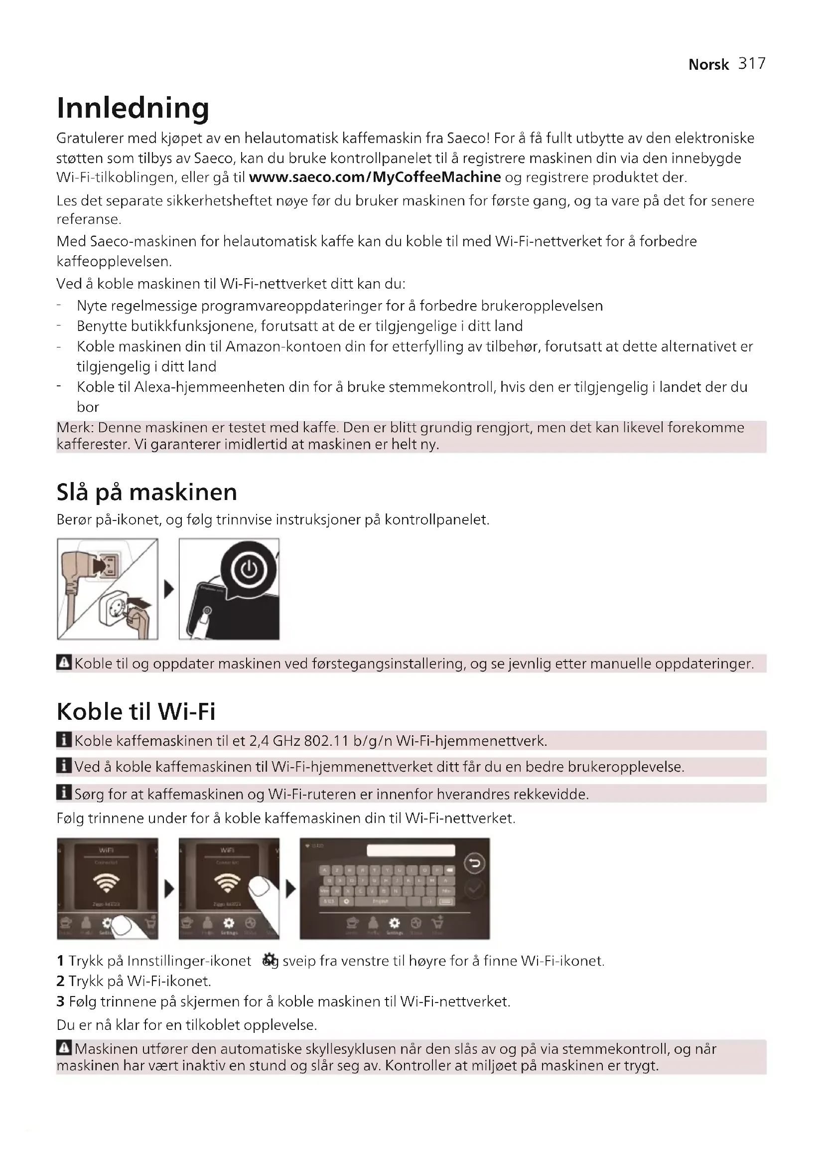 displayet. Melkerørene er tilstoppet. Melkebeholderen skal alltid oppbevares i kjøleskapet uten melkerørene. Det kan samle seg opp melkerester i melkerørene, slik at melkeflyten gjennom rørene blokkeres. Skyll melkerørene før oppbevaring. Det virker som maskinen lekker. Maskinen skyller den interne kretsen og bryggeenheten med vann. Dette vannet flyter gjennom det interne systemet og direkte ned i dryppebrettet. Dette er normalt. Tøm dryppebrettet hver dag eller så snart indikatoren for fullt dryppebrett spretter opp gjennom dryppbrettdekselet. Tips: Plasser en kopp under vanntuten for å samle opp skyllevannet og redusere mengden vann i dryppebrettet. Dryppebrettet er for fullt og har rent over. Dette gjør at det virker som at maskinen lekker. Tøm dryppebrettet hver dag eller så snart indikatoren for fullt dryppebrett spretter opp gjennom dryppebrettdekselet. Vanntanken er ikke satt helt inn, det lekker ut litt vann fra vanntanken og luft trekkes inn i maskinen. Kontroller at vanntanken er i riktig posisjon: Fjern den og sett den så langt inn i maskinen som mulig. Bryggeenheten er skitten/tilstoppet. Skyll bryggeenheten. Maskinen er ikke plassert på en vannrett flate. Plasser maskinen på en vannrett flate, slik at dryppebrettet ikke renner over og indikatoren for fullt dryppebrett fungerer som den skal.333 Norsk Problem Årsak Løsning Jeg får ikke aktivert AquaClean-vannfilteret, og maskinen ber om avkalking. Filteret ble ikke satt inn eller byttet ut i tide etter at AquaClean-påminnelsen ble vist på skjermen. Dette betyr at maskinen ikke lenger er helt kalkfri. Avkalk maskinen først, og installer deretter AquaClean-vannfilteret. Det nye vannfilteret passer ikke. Du forsøker å installere et annet filter enn AquaClean-vannfilteret. Bare AquaClean-vannfiltre passer i maskinen. Gummiringen på AquaClean- vannfilteret er ikke på plass. Sett gummiringen på AquaClean- vannfilteret igjen. Maskinen lager en høy lyd. Det er normalt at maskinen lager litt lyd under bruk. Hvis maskinen begynner å lage en annen type lyd, rengjør du bryggeenheten og smører den (se 'Smøre bryggeenheten'). AquaClean-vannfilteret ble ikke klargjort riktig, og det trekkes nå luft inn i maskinen. Fjern AquaClean-vannfilteret fra vanntanken og klargjør det ordentlig for bruk før du setter det på plass igjen. Se kapittelet AquaClean-vannfilter for trinnvise instruksjoner. Vanntanken er ikke satt helt inn, og luft trekkes inn i maskinen. Kontroller at vanntanken er i riktig posisjon: Fjern den og trykk den så langt inn i maskinen som mulig. Når jeg prøver å koble maskinen til Wi-Fi for første gang, kan ikke maskinen koble til Wi-Fi- nettverket. Wi-Fi-navnet og passordet ditt er ikke riktig. Kontroller Wi-Fi-navnet og -passordet. Kaffemaskinen og Wi-Fi-ruteren er ikke innenfor hverandres rekkevidde. Sørg for at kaffemaskinen og Wi-Fi- ruteren er innenfor rekkevidde av hverandre eller bruk en Wi-Fi-forsterker. Maskinen finner ikke Wi- Fi-hjemmenettverket. Wi-Fi-ruteren virker ikke som den skal. Kontroller at Wi-Fi-ruteren fungerer som den skal og er koblet til Internett. Maskinen er ikke innenfor rekkevidde for ruteren. Sørg for at maskinen er innenfor rekkevidde for ruteren. Alternativt bruker du en Wi-Fi-signalforsterker. Ruteren som kaffemaskinen forsøker å koble til, er et 5GHz dual-band, og kaffemaskinen forsøker ikke å koble til et 2,4GHz-nettverk. 5GHz-nettverk støttes ikke. Slå av 5GHz- båndet på ruteren midlertidig, og forsøk å pare kaffemaskinen på nytt til et annet bånd på samme ruter (2,4GHz). Slå på igjen 5GHz-båndet etter vellykket paring334 Norsk Problem Årsak Løsning Jeg kan ikke bruke Alexa og Amazon Smart Reorders enda. Du har ennå ikke koblet sammen Amazon- og Saeco-kontoen din. Følg instruksjonene på kontrollpanelet på maskinen for å koble sammen Amazon- og Saeco-kontoen din, slik at du kan bruke Alexa stemmekontroll og Amazon Smart Reorders. Merk: For å kunne bruke disse funksjonene må du ha en Alexa-app eller en Alexa-enhet, og du må aktivere Smart Reorders-tjenesten på Amazon. Wi-Fi-tilkoblingen til maskinen har tidligere vært i bruk, men fungerer ikke lenger. Wi-Fi-navnet og/eller passordet ditt har blitt endret. Følg instruksjonene under "Koble til Wi-Fi" og velg navnet på det nye Wi-Fi-nettverket du vil koble til. Wi-Fi-passordet har blitt endret. Følg instruksjonene under "Koble til Wi-Fi" og legg inn det nye Wi-Fi-passordet. Wi-Fi-ruteren virker ikke som den skal. Kontroller ruteren og kontroller at den fungerer. Wi-Fi-tilkoblingen kan bli avbrutt av elektromagnetisk eller andre forstyrrelser. Hold apparatet unna elektroniske apparater som kan forårsake interferens. Ingen av løsningene som er nevnt ovenfor, virker. Slå av maskinen og trekk ut støpselet. Koble deretter til igjen maskinen og slå den på for å sjekke Wi-Fi-tilkoblingen. Tekniske spesifikasjoner Produsenten forbeholder seg retten til å oppdatere de tekniske spesifikasjonene for produktet. Alle de forhåndsinnstilte mengdene er omtrentlige. Beskrivelse Verdi Størrelse (BxHxD) 262x383x448mm Vekt 8,3–8,8 kg Lengde på strømledningen 1200 mm Vannbeholder 1,8liter Kapasitet på kaffebønnetrakt 300g Kapasiteten til kaffegrutbeholderen 12 puter Melkebeholderens kapasitet 600ml Høydejusterbar tuthøyde 87–147 mm Nominell spenning – nominell effekt – strømtilførsel Se datamerket på innsiden av servicedøren Wi-Fi-frekvensbånd 2,4 GHz 802.11 b/g/n335 Norsk Samsvarserklæring Dap B.V. erklærer herved at de helautomatiske espressomaskinene SM6685, SM6682 og SM6680 er i samsvar med direktiv 2014/53/EU. Hele teksten i EU-samsvarserklæringen er tilgjengelig på følgende Internett-adresse: https://www.saeco.com. De helautomatiske espressomaskinene SM6685, SM6682 og SM6680 er utstyrt med en Wi-Fi-modul, 2,4GHz 802.11 b/g/n (kanaler 1..13). Maks sendeeffekt <100mW (20dBm). Wi-Fi Maskinen er klassifisert som nettverkutstyr iht. forordning (EU) nr. 801/2013, o