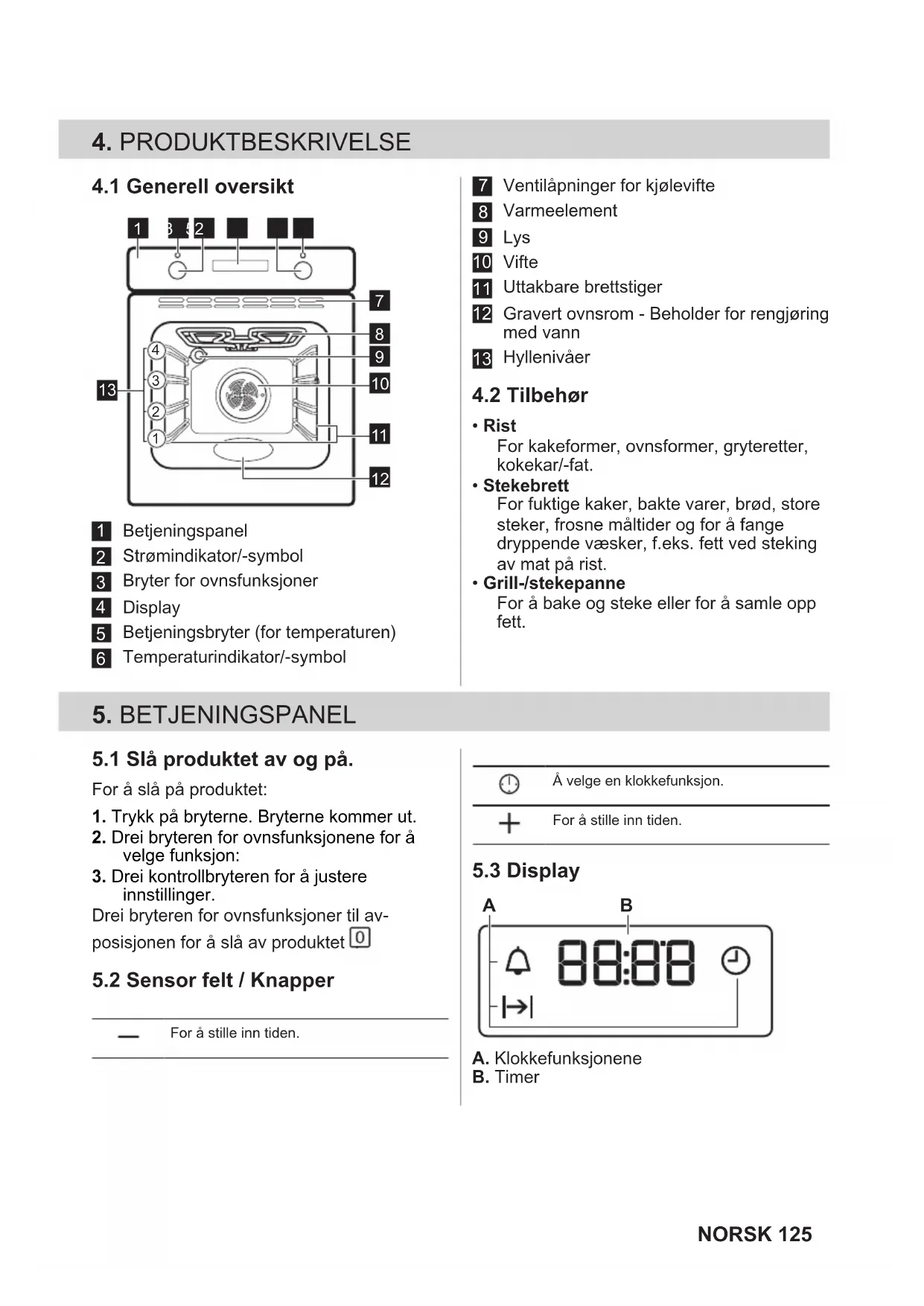 Tid på dagen For å stille inn, endre eller sjekke klokkeslett. Steketid For å velge hvor lenge produktet virker. Varselur For å stille inn en nedtelling. Denne funksjo‐ nen har ingen innvirkning på bruken av pro‐ duktet. Du kan stille inn denne funksjonen når som helst, selv når ovnen er slått av.