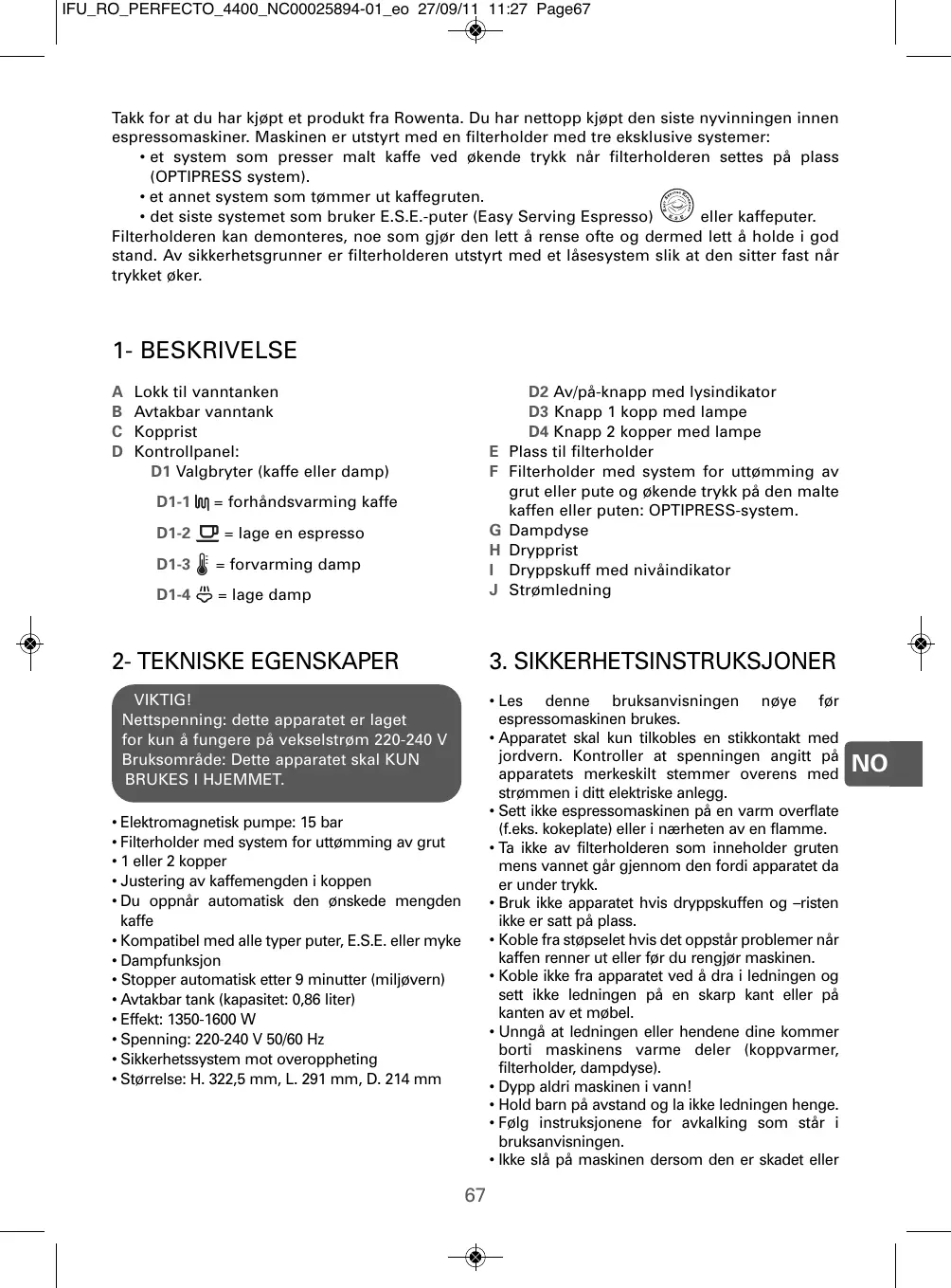 IFU_RO_PERFECTO_4400_NC00025894-01_eo 27/09/11 11:27 Page67 Takk for at du har kjøpt et produkt fra Rowenta. Du har nettopp kjøpt den siste nyvinningen innen espressomaskiner. Maskinen er utstyrt med en filterholder med tre eksklusive systemer:
