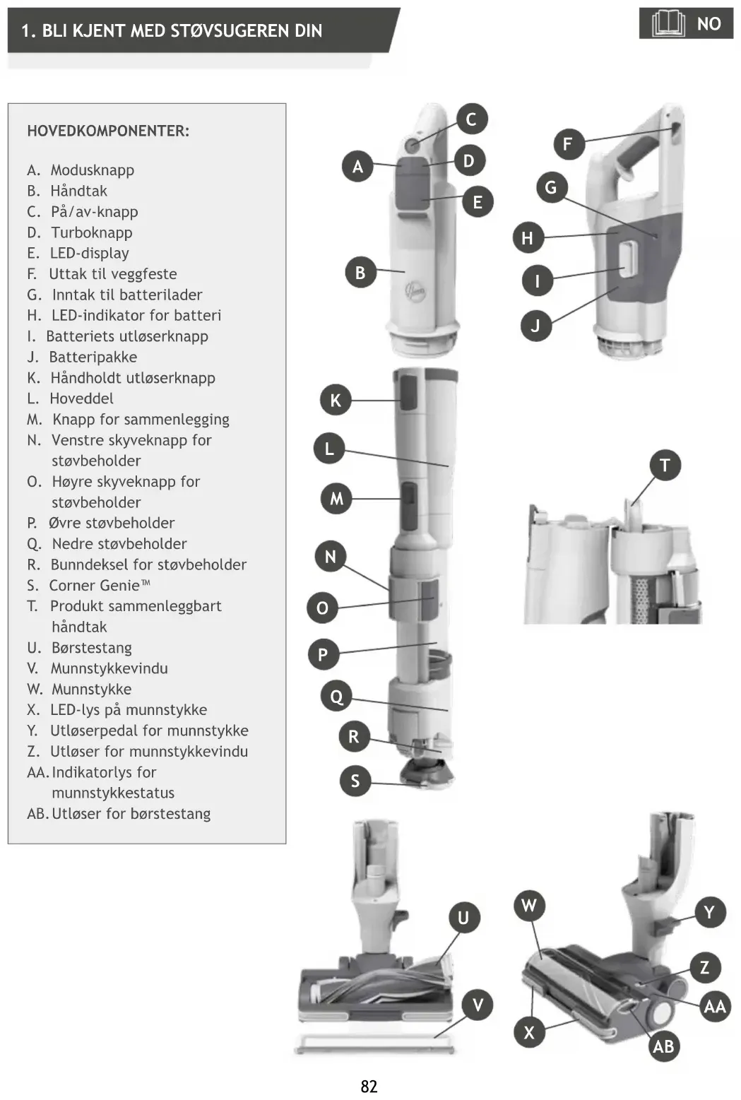 Bruk alltid originale deler fra Hoover. Disse er tilgjengelige fra din lokale Hoover-forhandler eller direkte fra Hoover. Når du bestiller deler, må du alltid oppgi modellnummeret ditt. Kvalitet Hoovers fabrikker har blitt uavhengig kvalitetsvurdert. Våre produkter produseres ved å bruke et kvalitetssystem som er i samsvar med ISO 9001. DIN GARANTI Garantibetingelsene for dette apparatet er som denert av vår representant i det landet der det ble solgt. Detaljer vedrørende disse betingelsene fås fra forhandleren der apparatet ble kjøpt. Salgskvitteringen må fremvises ved fremsetting av krav under betingelsene i denne garantien. 2 ÅRS BATTERIGARANTI VIKTIG: Batteriet som medfølger dette rengjøringsapparatet har 2 års garanti fra kjøpsdato. Etter 2 år må kunden selv stå for kostnaden av et nytt batteri. Kan endres uten forvarsel. NO91