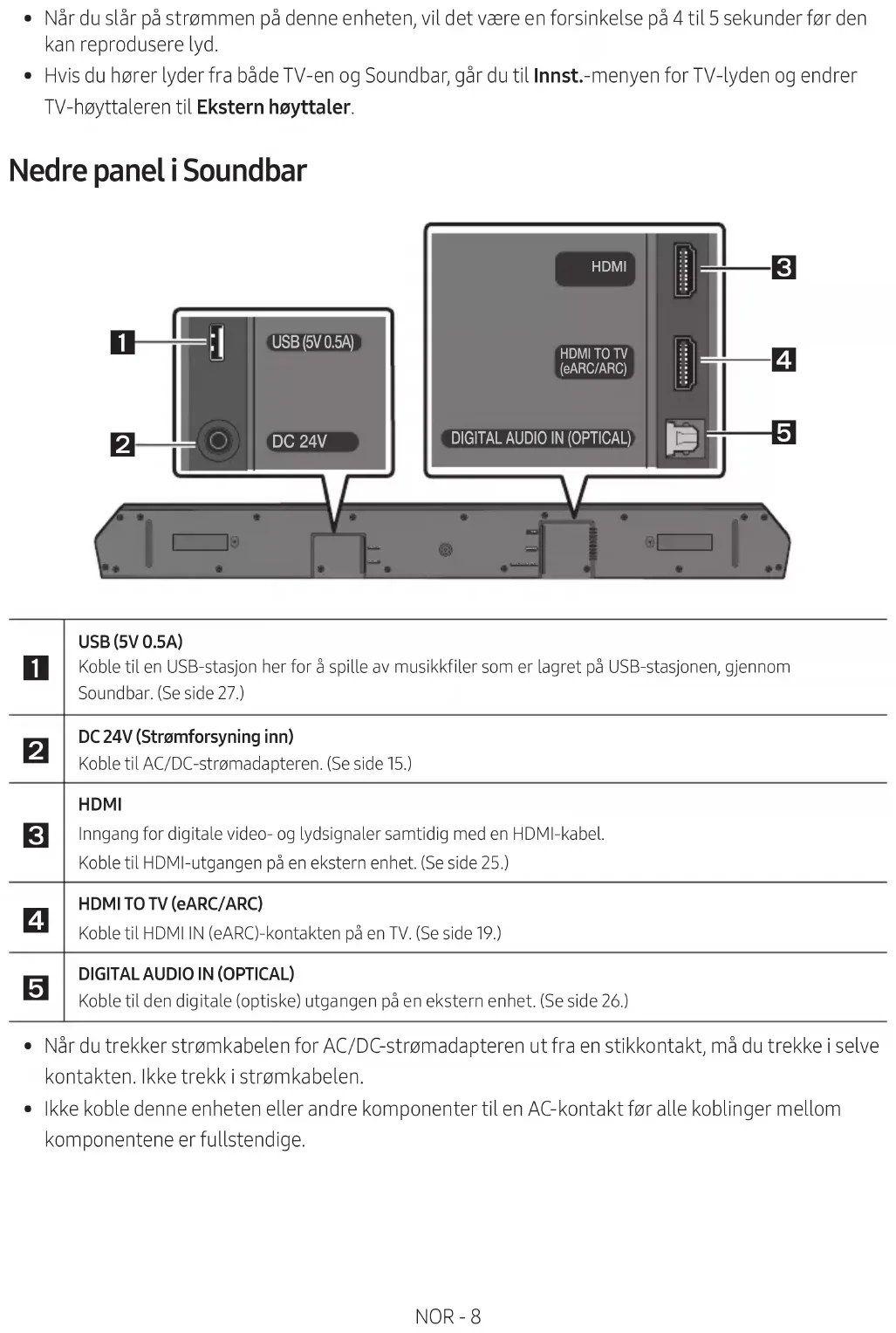 - Utilstrekkelig avstand fra TV-en kan føre til akustiske problemer.NOR - 36 11 PROGRAMVARE- OPPDATERING Samsung kan komme til å tilby oppdateringer av fastvaren for Soundbar i fremtiden. USB-port HDMI HDMI TO TV(eARC/ARC)DIGITAL AUDIO IN (OPTICAL)USB (5V 0.5A)DC 24VUSB (5V 0.5A) Hvis en oppdatering er tilgjengelig, kan du oppdatere fastvaren ved å koble en USB- stasjonen med fastvareoppdateringen til USB- porten på Soundbar. USB-oppdatering Når oppdateringen er fullført, beholdes alle de tilpassede brukerinnstillingene.