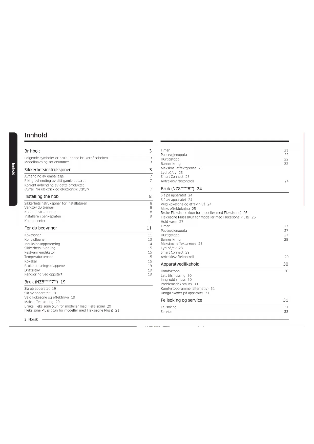 - (opłata według taryfy operatora) http://www.samsung.com/pl/ support/ LITHUANIA 8-800-77777 www.samsung.com/lt/support LATVIA 8000-7267 www.samsung.com/lv/support ESTONIA 800-7267 www.samsung.com/ee/supportInduksjonskom- fyrtopp Brukerhåndbok NZ84C5047** / NZ85C5047** / NZ84C6057** / NZ84C6058** / NZ85C6057** / NZ85C6058**2 Norsk Innhold Innhold Timer 21 Pause/gjenoppta 22 Hurtigstopp 22 Barnesikring 22 Maksimal effektgrense 23 Lyd på/av 23 Smart Connect 23 Avtrekksviftekontroll 24 Bruk (NZ8*****8**) 24 Slå på apparatet 24 Slå av apparatet 24 Velg kokesone og effektnivå 24 Maks effektøkning 25 Bruke Fleksisone (kun for modeller med Fleksisone) 25 Fleksisone Pluss (Kun for modeller med Fleksisone Pluss) 26 Hold varm 27 Timer 27 Pause/gjenoppta 27 Hurtigstopp 27 Barnesikring 28 Maksimal effektgrense 28 Lyd på/av 28 Smart Connect 29 Avtrekksviftekontroll 29 Apparatvedlikehold 30 Komfyrtopp 30 Lett tilsmussing 30 Inngrodd smuss 30 Problematisk smuss 30 Komfyrtoppramme (alternativ) 31 Unngå skader på apparatet 31 Feilsøking og service 31 Feilsøking 31 Service 33 Innhold Br hbok 3 Følgende symboler er bruk i denne brukerhåndboken: 3 Modellnavn og serienummer 3 Sikkerhetsinstruksjoner 3 Avhending av emballasje 7 Riktig avhending av ditt gamle apparat 7 Korrekt avhending av dette produktet (Avfall fra elektrisk og elektronisk utstyr) 7 Installing the hob 8 Sikkerhetsinstruksjoner for installatøren 8 Verktøy du trenger 8 Koble til strømnettet 8 Installere i benkeplaten 9 Komponenter 11 Før du begynner 11 Kokesoner 11 Kontrollpanel 13 Induksjonsoppvarming 14 Sikkerhetsutkobling 15 Restvarmeindikator 15 Temperatursensor 15 Kokekar 16 Bruke berøringsknappene 19 Driftsstøy 19 Rengjøring ved oppstart 19 Bruk (NZ8*****7**) 19 Slå på apparatet 19 Slå av apparatet 19 Velg kokesone og effektnivå 19 Maks effektøkning 20 Bruke Fleksisone (kun for modeller med Fleksisone) 20 Fleksisone Pluss (Kun for modeller med Fleksisone Pluss) 21Norsk 3 Br hbok Br hbok Ta deg tid til å lese denne brukerhåndboken. Vær spesielt oppmerksom på sikkerhetsinformasjonen som du nner i følgende kapittel, før du bruker apparatet ditt. Behold denne håndboken for fremtidige oppslag. Hvis du overlater apparatet til andre eiere, må du huske å levere med manualen til den nye eieren. Følgende symboler er bruk i denne brukerhåndboken: ADVARSEL Farer eller usikker bruk som kan føre til alvorlig personskade eller dødsfall. FORSIKTIG Farer eller usikker bruk som kan føre til mindre personskader eller skader på gjenstander. FORSIKTIG For å redusere risikoen for brann, elektrisk støt eller personskader når du bruker komfyrtoppen, følger du disse grunnleggende sikkerhetsforholdsreglene. MERK Praktiske tips, anbefalinger eller informasjon som hjelper brukere med å betjene produktet. Modellnavn og serienummer Både modellnavnet og serienummeret er merket under komfyrbasen. Skriv ned informasjonen eller fest den ekstra produktetiketten (nnes på toppen av produktet) på gjeldende side for senere bruk. Modellnavn Serienummer Sikkerhetsinstruksjoner Sikkerhetsaspektene for dette apparatet er i samsvar med alle godtatte tekniske standarder og sikkerhetsstandarder. Som produsenter mener vi imidlertid også at det er vårt ansvar å gjøre dere kjent med følgende sikkerhetsinstrukser. ADVARSEL Dette apparatet skal ikke brukes av personer (inkludert barn) med svekkede fysiske, sensoriske eller mentale evner, eller av personer som mangler relevant erfaring og kunnskap, med mindre de er under oppsyn eller får instruksjoner av en person som er ansvarlig for deres sikkerhet. Barn må være under oppsyn for å sikre at de ikke leker med apparatet. Dette apparatet kan brukes av barn fra åtte år og oppover, og av personer med reduserte fysiske, sensoriske eller mentale evner, eller som mangler erfaring og kunnskap, såfremt de holdes under oppsyn eller er blitt instruert i trygg bruk av apparatet og forstår farene som er involvert. Barn skal ikke leke med apparatet. Rengjøring og vedlikehold må ikke utføres av barn uten oppsyn. Innretningen for frakobling må være innlemmet i den faste kablingen i henhold til kablingsregler.4 Norsk Sikkerhetsinstruksjoner Sikkerhetsinstruksjoner Dette apparatet er ikke ment for bruk med eksternt tidsur eller separat ernkontroll. FORSIKTIG: Tilberedningsprosessen må overvåkes. En kort tilberedningsprosess må overvåkes kontinuerlig. For å unngå overoppvarming må apparatet ikke monteres bak en dekorativ dør. ADVARSEL: Dette apparatet og deler man kan komme borti, blir varme under bruk. Pass på å unngå å berøre varmeelementene. Barn under åtte år må holdes unna med mindre de er under kontinuerlig oppsyn. ADVARSEL: Det kan være farlig å ikke holde oppsyn med maten hvis du lager mat på en komfyrtopp med fett eller olje. Dette kan føre til brann. Du må ALDRI prøve å slukke en brann med vann, men heller slå av apparatet og deretter dekke til ammen med f.eks. et lokk eller et brannteppe. ADVARSEL: Brannfare: Ikke oppbevar gjenstander på tilberedningsoveratene. Det må være mulig å koble apparatet fra strømforsyningen etter installasjonen. Frakoblingen kan oppnås ved å ha støpselet tilgjengelig eller ved å legge inn en bryter i kablingen i samsvar med kablingsreglene. Hvis strømledningen blir skadet, må den byttes ut av produsenten, produsentens serviceagent eller en annen kvalisert person, for å unngå farer. Den angitte festemetoden må ikke være avhengig av bruk av klebemidler, ettersom dette ikke regnes som en pålitelig festemetode. ADVARSEL: Hvis platen er sprukket, slå av apparatet for å unngå muligheten for elektrisk støt. Under bruk blir apparatet varmt. Pass på å unngå å berøre varmeelementene inne i komfyrtoppen. ADVARSEL: Tilgjengelige deler kan bli varme under bruk. Små barn må holdes unna. Det skal ikke brukes en damprenser. Metallgjenstander som kniver, gaer, skjeer og lokk må ikke plasseres på komfyrtoppens overate