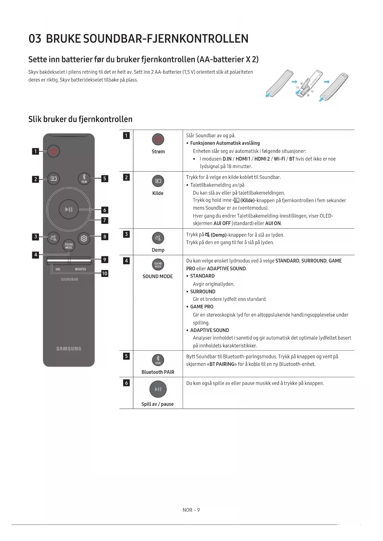 - Ikke koble denne enheten eller andre komponenter til et vekselstrømuttak før alle tilkoblinger mellom komponentene er fullført.NOR – 9 03 BRUKE SOUNDBAR-FJERNKONTROLLEN Sette inn batterier før du bruker fjernkontrollen (AA-batterier X 2) Skyv bakdekselet i pilens retning til det er helt av. Sett inn 2 AA-batterier (1,5 V) orientert slik at polariteten deres er riktig. Skyv batteridekselet tilbake på plass. Slik bruker du fjernkontrollen