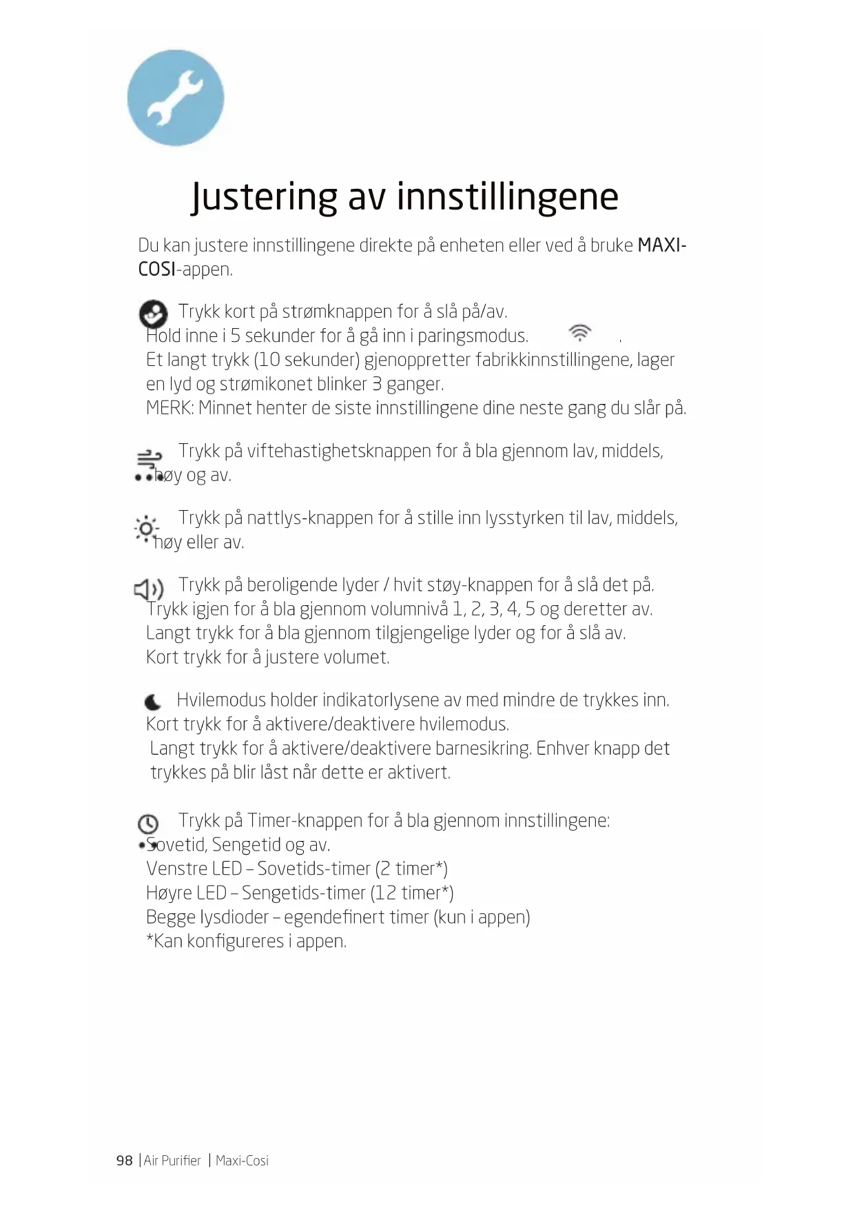 Et langt trykk (10 sekunder) gjenoppretter fabrikkinnstillingene, lager en lyd og strømikonet blinker 3 ganger. MERK: Minnet henter de siste innstillingene dine neste gang du slår på. Trykk på viftehastighetsknappen for å bla gjennom lav, middels, høy og av. Trykk på nattlys-knappen for å stille inn lysstyrken til lav, middels, høy eller av. Trykk på beroligende lyder / hvit støy-knappen for å slå det på. Trykk igjen for å bla gjennom volumnivå 1, 2, 3, 4, 5 og deretter av. Langt trykk for å bla gjennom tilgjengelige lyder og for å slå av. Kort trykk for å justere volumet. Hvilemodus holder indikatorlysene av med mindre de trykkes inn. Kort trykk for å aktivere/deaktivere hvilemodus. Langt trykk for å aktivere/deaktivere barnesikring. Enhver knapp det trykkes på blir låst når dette er aktivert. Trykk på Timer-knappen for å bla gjennom innstillingene: Sovetid, Sengetid og av. Venstre LED – Sovetids-timer (2 timer*) Høyre LED – Sengetids-timer (12 timer*) Begge lysdioder – egendefinert timer (kun i appen) *Kan konfigureres i appen.Maxi-Cosi