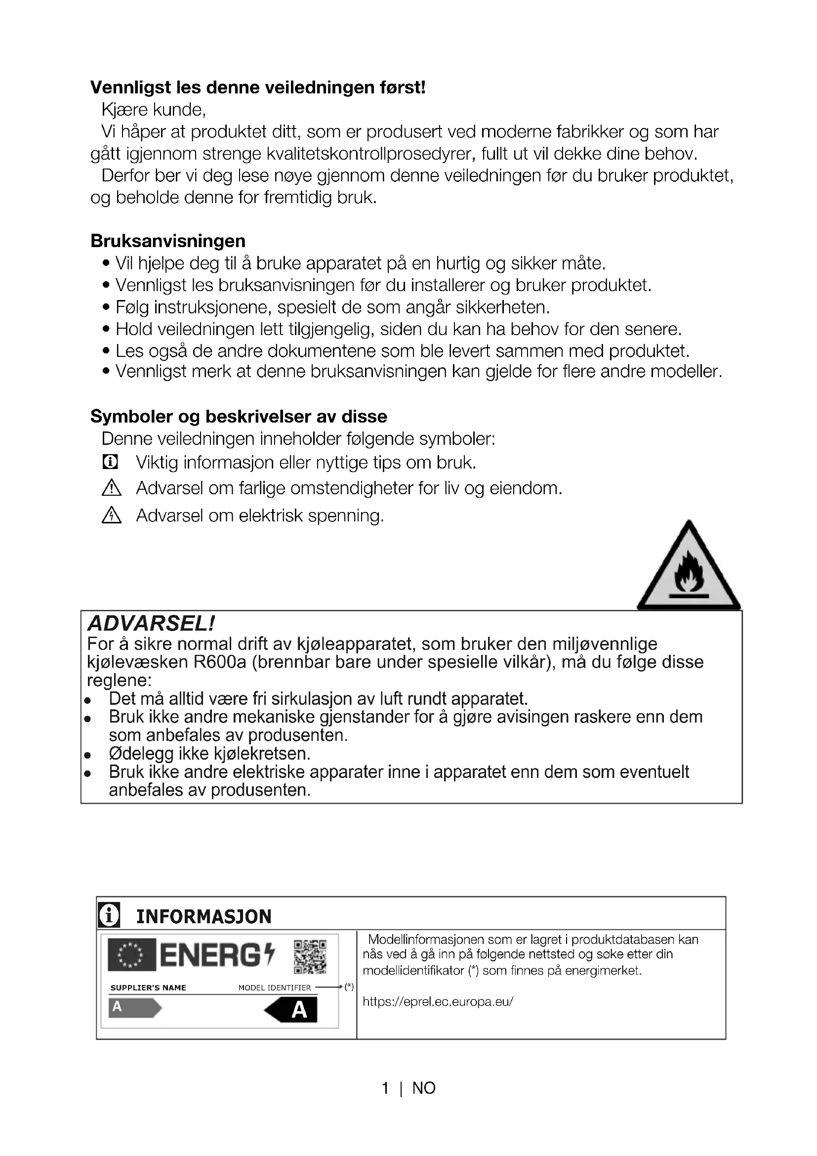 Advarsel om elektrisk spenning. ADVARSEL! For å sikre normal drift av kjøleapparatet, som bruker den miljøvennlige kjølevæsken R600a (brennbar bare under spesielle vilkår), må du følge disse reglene: