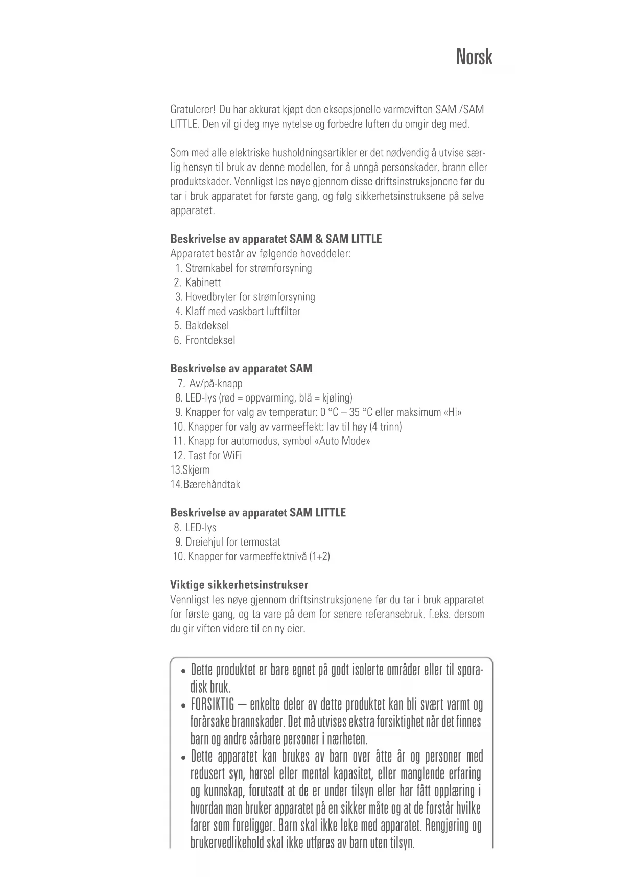 - Dersom apparatet er utenfor reparasjonsmuligheter, gjør det ubrukbart umiddelbart og lever det til et returpunkt gitt til formålet. Avhending EU-direktiv 2012 / 19 / EF vedrørende elektriske og elektroniske apparater (Waste Electrical and Electronic Equipment - WEEE) sier at gamle elektriske husholdningsapparater ikke må kastes som vanlig restavfall. Gamle appa- rater må samles inn separat for å optimalisere gjenbruk og resirkulering av materialene de inneholder og redusere påvirkningen på menneskers helse og miljøet. Det overkryssede søppelkassesymbolet er for å minne om din forpliktelse om at du når du kaster apparatet må det samles inn separat. Forbrukerne må kontakte lokale myndigheter eller forhand- ler for informasjon angående riktig avhending av sitt gamle apparat. Spesifikasjoner Sam Rangert spenning 220 – 240 V / 50 Hz Temperaturområde 0 ° – 35 °C / > 35 °C = Hi Strømforbruk 700 W (min.) Utgangseffekt 2‘000 W (maks.) Dimensjoner 149 x 422 x 156 mm (bredde x høyde x dybde) Vekt 3.5 kg Lydnivå 30 – 52 dB(A) I samsvar med EU-forskrifter CE / WEEE / RoHS / EAC / UKCA Spesifikasjoner Sam little Rangert spenning 220 – 240 V / 50 Hz Strømforbruk 800 W (min.) Utgangseffekt 1‘500 W (maks.) Dimensjoner 127 x 365 x 132 mm (bredde x høyde x dybde) Vekt 2.6 kg Lydnivå 30 – 50 dB(A) I samsvar med EU-forskrifter CE / WEEE / RoHS / EAC / UKCA Alle rettigheter med hensyn til tekniske endringer forbeholdesSpesifikasjon Symbol Verdi Enhet Varmeytelse (Sam / Sam little) Nominell varmeytelse P nom