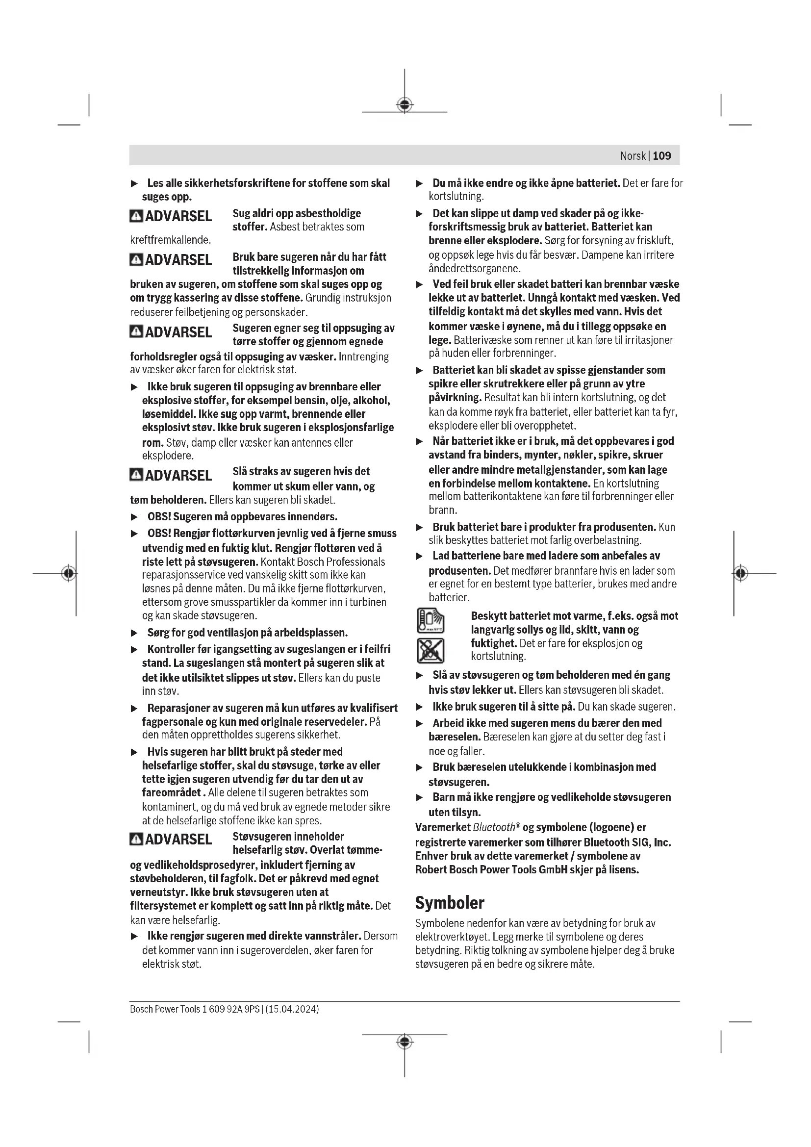 Målt med sugeslange(20) og bøyd munnstykke(22) C) Avhengig av batteriet D) Begrenset ytelse ved temperatur under 0°C E) De mobile enhetene må være kompatible med Bluetooth® Low Energy-enheter (versjon 4.2) og støtte Generic Access Profile (GAP). F) Rekkevidden kan variere mye avhengig av ytre betingelser, inkludert mottaksenheten som brukes. Inne i lukkede rom, og ved metalliske hindringer (f.eks. vegger, hyller, skap osv.), kan Bluetooth®-rekkevidden være betydelig mindre. Verdiene kan variere avhengig av produktet, bruksområdet og miljøforholdene. Du finner mer informasjon på www.bosch-professional.com/wac. Støy-/vibrasjonsinformasjon Støyemisjon målt i henhold tilEN60335‑2‑69. Vanlig A-lydtrykknivå for støvsugeren er79dB(A). Usikkerhet K=2dB. Støynivået kan overskride de angitte verdiene under arbeidet. Bruk hørselvern! Vibrasjon totalt a