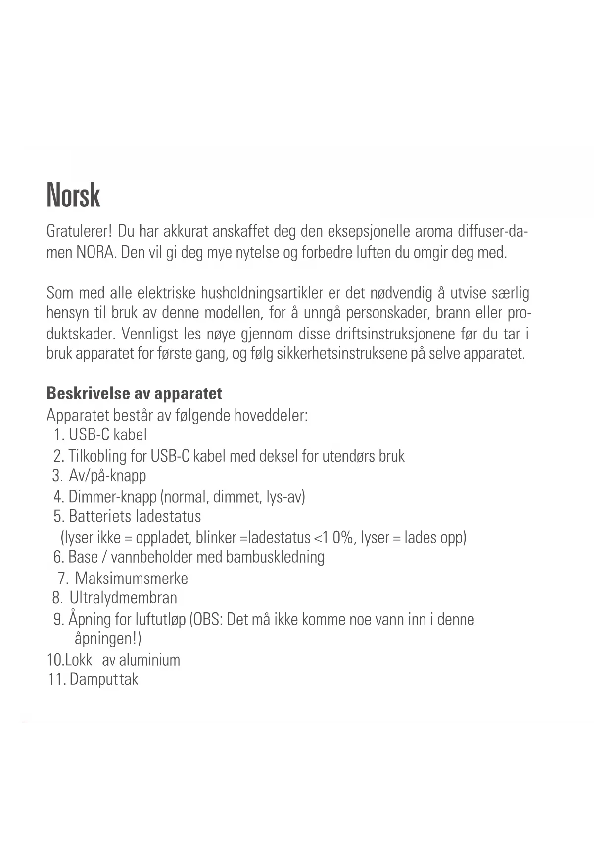 - Batteriet lades opp: LED lyser konstant Når apparatet er helt oppladet, slukkes LED’en. Nå kan du ta ut USB-kabe- len og bruke apparatet i batteridrift (i opptil 7 h i strekk). Merknad: Dersom du ønsker å endre duften, tøm Nora fullstendig og rengjør vannbeholderen med en fuktig klut. Fyll Nora på nytt og hell dråpene i enheten ved å følge instruksjonene.Rengjøring Før allslags vedlikehold og etter hvert bruk, slå av apparatet (3) og trekk USB-ka- belen (1) ut av apparatet (2). OBS: Aldri senk enheten i vann (fare for kortslutning).