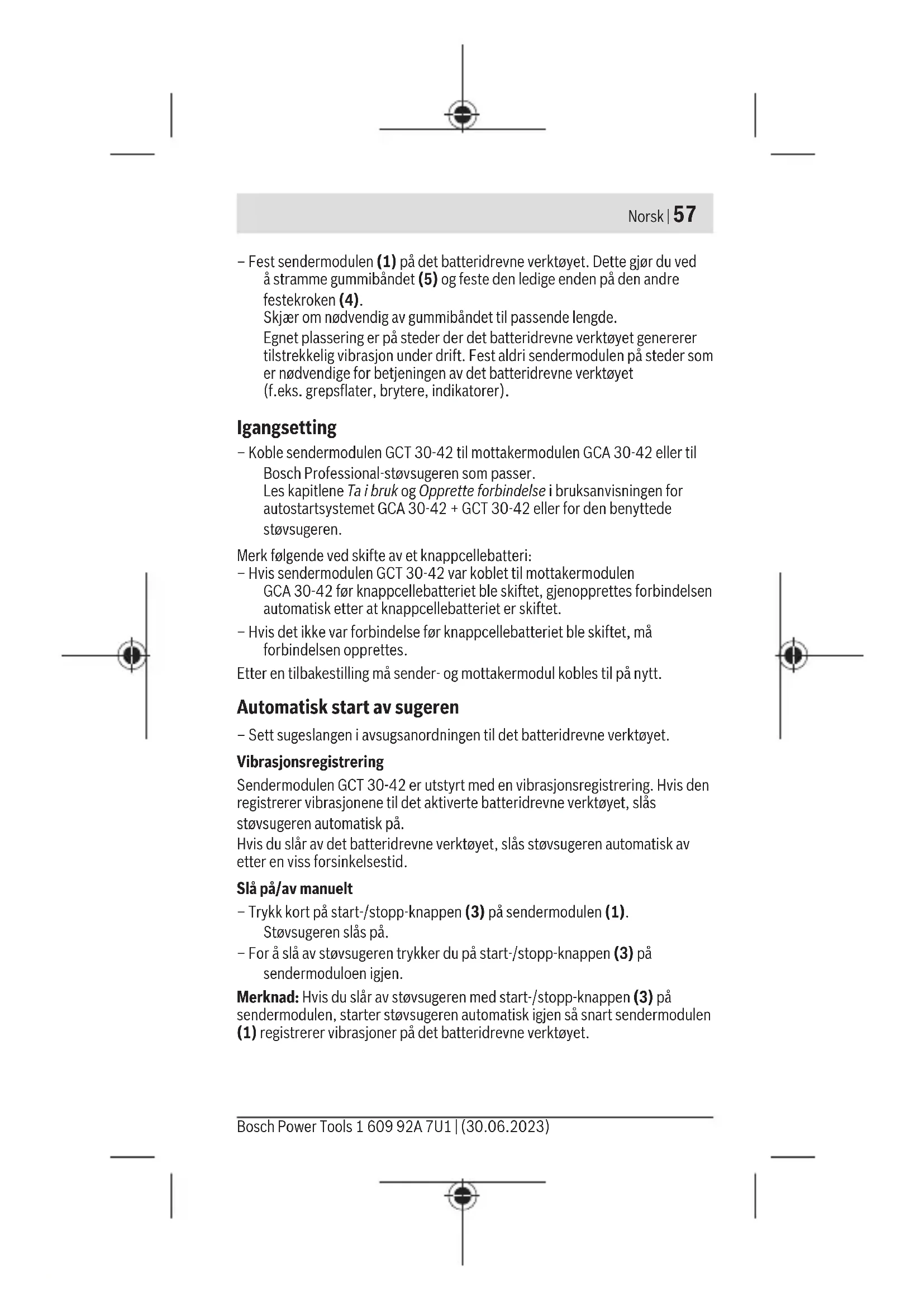 43x18x42mm Lengde på gummibånd 240mm Kapslingsgrad IP54 Dataoverføring Bluetooth® Bluetooth® 4.2 (Low Energy) Benyttet frekvensområde 2402–2480 MHz Utgangseffekt <10mW Strømforsyning Bluetooth® Low Energy Module Knappcellebatteri 3V litiumbatteri, CR2032 A) Uten gummibånd Verdiene kan variere avhengig av produktet, bruksområdet og miljøforholdene. Du finner mer informasjon på www.bosch-professional.com/wac. Montering og drift Montere sendermodulen – Sett den ene enden av gummibåndet (5) på en av de to festekrokene (4). 1 609 92A 7U1 | (30.06.2023) Bosch Power ToolsNorsk | 57 – Fest sendermodulen (1) på det batteridrevne verktøyet. Dette gjør du ved å stramme gummibåndet (5) og feste den ledige enden på den andre festekroken (4). Skjær om nødvendig av gummibåndet til passende lengde. Egnet plassering er på steder der det batteridrevne verktøyet genererer tilstrekkelig vibrasjon under drift. Fest aldri sendermodulen på steder som er nødvendige for betjeningen av det batteridrevne verktøyet (f.eks.grepsflater, brytere, indikatorer). Igangsetting – Koble sendermodulenGCT 30-42 til mottakermodulenGCA 30-42 eller til Bosch Professional-støvsugeren som passer. Les kapitlene Ta i bruk og Opprette forbindelse i bruksanvisningen for autostartsystemet GCA 30-42 + GCT 30-42 eller for den benyttede støvsugeren. Merk følgende ved skifte av et knappcellebatteri: – Hvis sendermodulen GCT30-42 var koblet til mottakermodulen GCA30-42 før knappcellebatteriet ble skiftet, gjenopprettes forbindelsen automatisk etter at knappcellebatteriet er skiftet. – Hvis det ikke var forbindelse før knappcellebatteriet ble skiftet, må forbindelsen opprettes. Etter en tilbakestilling må sender- og mottakermodul kobles til på nytt. Automatisk start av sugeren – Sett sugeslangen i avsugsanordningen til det batteridrevne verktøyet. Vibrasjonsregistrering Sendermodulen GCT 30-42 er utstyrt med en vibrasjonsregistrering. Hvis den registrerer vibrasjonene til det aktiverte batteridrevne verktøyet, slås støvsugeren automatisk på. Hvis du slår av det batteridrevne verktøyet, slås støvsugeren automatisk av etter en viss forsinkelsestid. Slå på/av manuelt – Trykk kort på start-/stopp-knappen (3) på sendermodulen (1). Støvsugeren slås på. – For å slå av støvsugeren trykker du på start-/stopp-knappen (3) på sendermoduloen igjen. Merknad: Hvis du slår av støvsugeren med start-/stopp-knappen (3) på sendermodulen, starter støvsugeren automatisk igjen så snart sendermodulen (1) registrerer vibrasjoner på det batteridrevne verktøyet. Bosch Power Tools 1 609 92A 7U1 | (30.06.2023)58 | Norsk Tilbakestille til fabrikkinnstillingene – Hold start-/stopp-knappen (3) inntrykt helt til LED-statusindikatoren (2) blinker blått fire ganger med korte mellomrom. Tilstandsvisninger