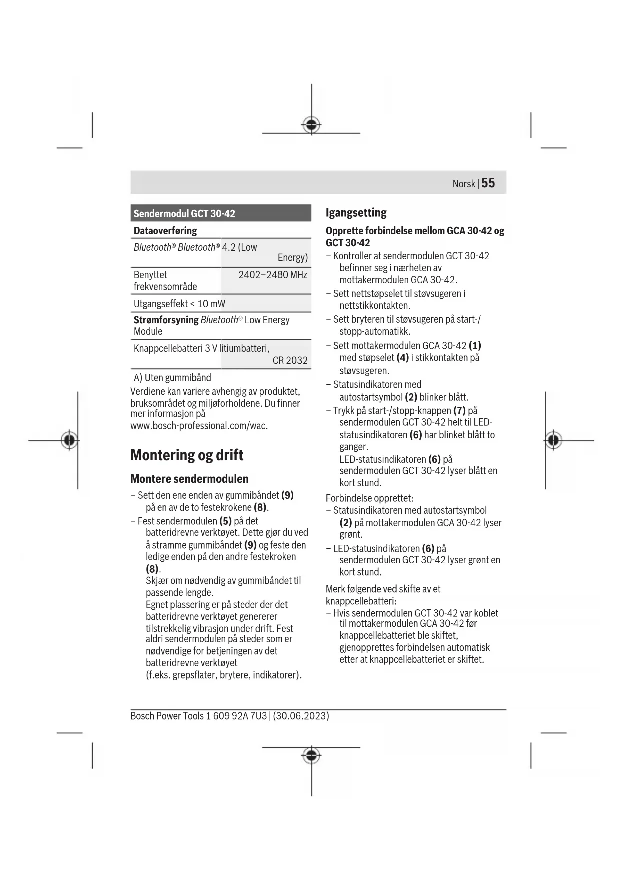 43x18x42mm Lengde på gummibånd 240mm Kapslingsgrad IP54 1 609 92A 7U3 | (30.06.2023) Bosch Power ToolsNorsk | 55 Sendermodul GCT 30-42 Dataoverføring Bluetooth® Bluetooth® 4.2 (Low Energy) Benyttet frekvensområde 2402–2480 MHz Utgangseffekt < 10mW Strømforsyning Bluetooth® Low Energy Module Knappcellebatteri 3V litiumbatteri, CR2032 A) Uten gummibånd Verdiene kan variere avhengig av produktet, bruksområdet og miljøforholdene. Du finner mer informasjon på www.bosch-professional.com/wac. Montering og drift Montere sendermodulen – Sett den ene enden av gummibåndet (9) på en av de to festekrokene (8). – Fest sendermodulen (5) på det batteridrevne verktøyet. Dette gjør du ved å stramme gummibåndet (9) og feste den ledige enden på den andre festekroken (8). Skjær om nødvendig av gummibåndet til passende lengde. Egnet plassering er på steder der det batteridrevne verktøyet genererer tilstrekkelig vibrasjon under drift. Fest aldri sendermodulen på steder som er nødvendige for betjeningen av det batteridrevne verktøyet (f.eks.grepsflater, brytere, indikatorer). Igangsetting Opprette forbindelse mellom GCA30-42 og GCT30-42 – Kontroller at sendermodulen GCT30-42 befinner seg i nærheten av mottakermodulen GCA30-42. – Sett nettstøpselet til støvsugeren i nettstikkontakten. – Sett bryteren til støvsugeren på start-/ stopp-automatikk. – Sett mottakermodulen GCA30-42 (1) med støpselet (4) i stikkontakten på støvsugeren. – Statusindikatoren med autostartsymbol(2) blinker blått. – Trykk på start-/stopp-knappen (7) på sendermodulen GCT30-42 helt til LED- statusindikatoren (6) har blinket blått to ganger. LED-statusindikatoren (6) på sendermodulen GCT 30-42 lyser blått en kort stund. Forbindelse opprettet: – Statusindikatoren med autostartsymbol (2) på mottakermodulen GCA30-42 lyser grønt. – LED-statusindikatoren (6) på sendermodulen GCT30-42 lyser grønt en kort stund. Merk følgende ved skifte av et knappcellebatteri: – Hvis sendermodulen GCT30-42 var koblet til mottakermodulen GCA30-42 før knappcellebatteriet ble skiftet, gjenopprettes forbindelsen automatisk etter at knappcellebatteriet er skiftet. Bosch Power Tools 1 609 92A 7U3 | (30.06.2023)56 | Norsk – Hvis det ikke var forbindelse før knappcellebatteriet ble skiftet, må forbindelsen opprettes. Etter en tilbakestilling må sender- og mottakermodul kobles til på nytt. Automatisk start av sugeren – Sett sugeslangen i avsugsanordningen til det batteridrevne verktøyet. Vibrasjonsregistrering Sendermodulen GCT 30-42 er utstyrt med en vibrasjonsregistrering. Hvis den registrerer vibrasjonene til det aktiverte batteridrevne verktøyet, slås støvsugeren automatisk på. Hvis du slår av det batteridrevne verktøyet, slås støvsugeren automatisk av etter en viss forsinkelsestid. Slå på/av manuelt – Trykk kort på start-/stopp-knappen (7) på sendermodulen (5). Støvsugeren slås på. – For å slå av støvsugeren trykker du på start-/stopp-knappen (7) på sendermoduloen igjen. Merknad: Hvis du slår av støvsugeren med start-/stopp-knappen (7) på sendermodulen, starter støvsugeren automatisk igjen så snart sendermodulen (5) registrerer vibrasjoner på det batteridrevne verktøyet. Tilbakestille til fabrikkinnstillingene – Mottakermodul GCA30-42: Trykk på knappen (3) helt til statusindikatoren med autostartsymbol(2) blinker blått fire ganger etter hverandre med korte mellomrom. – Sendermodul GCT30-42: Trykk på start-/stopp-knappen (7) helt til LED- statusindikatoren (6) blinker blått fire ganger etter hverandre med korte mellomrom. Tilstandsvisninger GCA 30-42: Statusindikator (2) Betydning/årsak Løsning Blå – Forbindelse blir opprettet eller – Data mottas