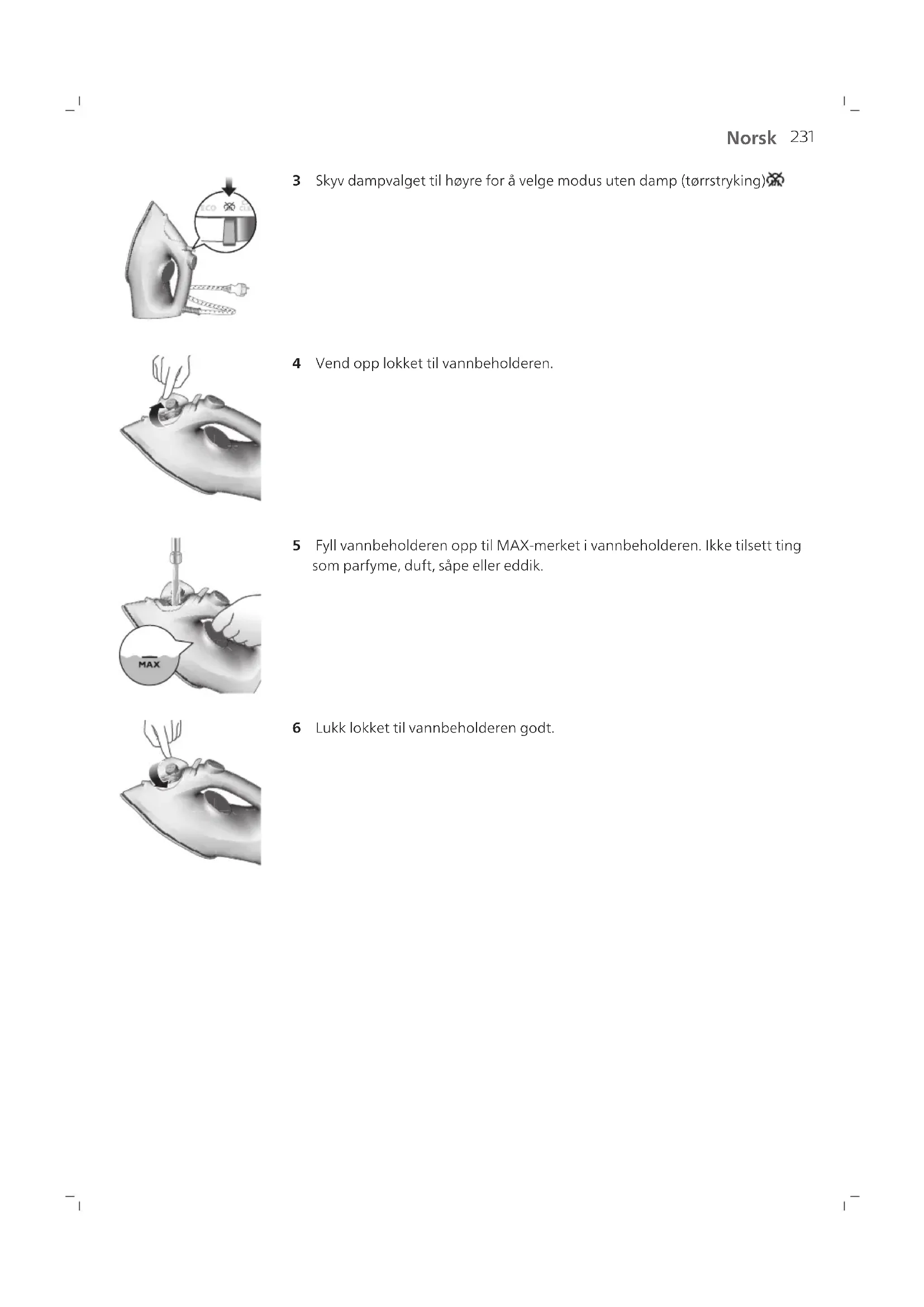 1 Dampvalg 2 Dampstøtknapp 3 Vanntåke 4 Nettledning 5 Ledningsvikling 6 Indikatorlys 7 Temperaturbryter 8 Lokk til vannbeholder Bruke apparatet Bruksforberedelse Merk: Strykejernet kan avgi litt damp når du bruker det for første gang. Dette slutter etter en liten stund. Vanntypen som skal brukes Dette apparatet egnet for bruk med springvann. Hvis du bor i et område med hardt vann, anbefaler vi at du blander en like stor mengde springvann med destillert eller demineralisert vann. Dette hindrer en rask dannelse av kalkavleiringer, mens apparatet får forlenget levetiden sin. Ikke legg til parfyme, vann fra tørketrommelen, eddik, stivelse, avkalkingsmidler, strykemidler, kjemisk avkalket vann eller andre kjemikalier, siden dette kan føre til vannsprut, brune flekker eller skade på apparatet Fylle vannbeholderen 1 Ikke koble til strykejernet. 2 Forsikre deg om at strykejernet er avkjølt.231 Norsk 3 Skyv dampvalget til høyre for å velge modus uten damp (tørrstryking) . 4 Vend opp lokket til vannbeholderen. 5 Fyll vannbeholderen opp til MAX-merket i vannbeholderen. Ikke tilsett ting som parfyme, duft, såpe eller eddik. 6 Lukk lokket til vannbeholderen godt.232 Norsk