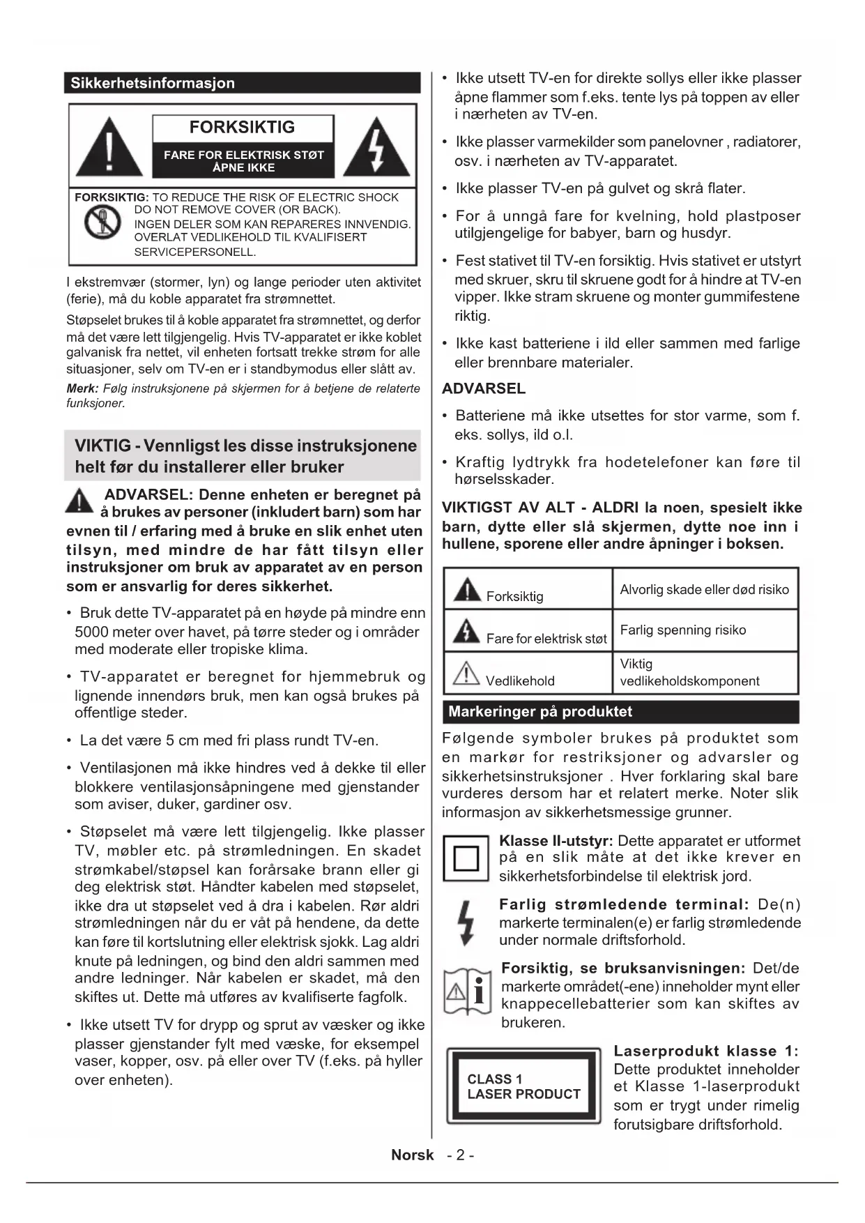 - Kraftig lydtrykk fra hodetelefoner kan føre til hørselsskader. VIKTIGST AV ALT - ALDRI la noen, spesielt ikke barn, dytte eller slå skjermen, dytte noe inn i hullene, sporene eller andre åpninger i boksen. Forksiktig Alvorlig skade eller død risiko Fare for elektrisk støt Farlig spenning risiko Vedlikehold Viktig vedlikeholdskomponent Markeringer på produktet Følgende symboler brukes på produktet som en markør for restriksjoner og advarsler og sikkerhetsinstruksjoner . Hver forklaring skal bare vurderes dersom har et relatert merke. Noter slik informasjon av sikkerhetsmessige grunner. Klasse II-utstyr: Dette apparatet er utformet på en slik måte at det ikke krever en sikkerhetsforbindelse til elektrisk jord. Farlig strømledende terminal: De(n) markerte terminalen(e) er farlig strømledende under normale driftsforhold.