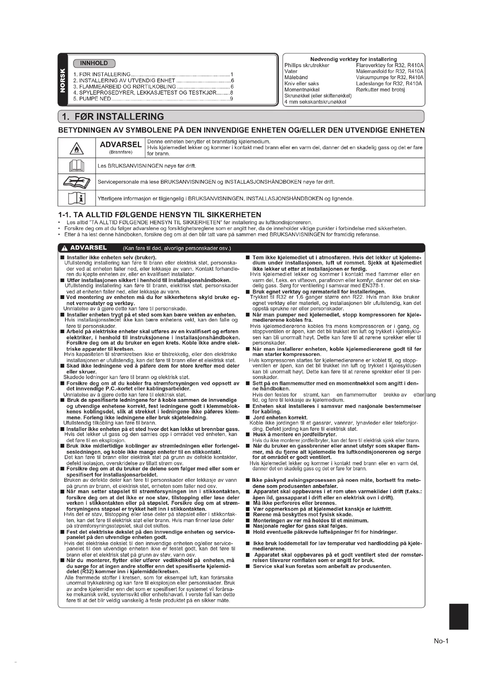 Bruk egnet verktøy og rørmateriell for installeringen. Trykket til R32 er 1,6 ganger større enn R22. Hvis man ikke bruker egnet verktøy eller materiell, og installasjonen blir ufullstendig, kan det oppstå sprukne rør eller personskader.
