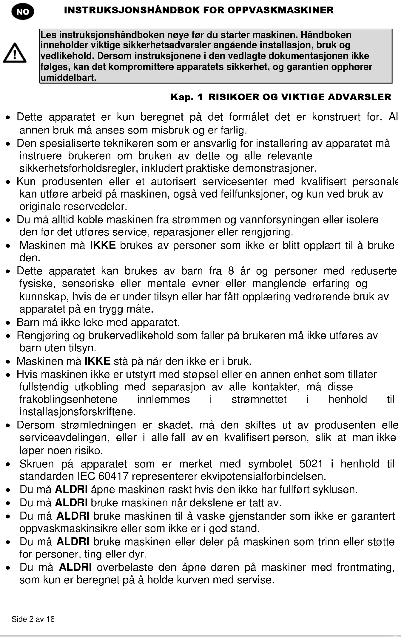 Les instruksjonshåndboken nøye før du starter maskinen. Håndboken inneholder viktige sikkerhetsadvarsler angående installasjon, bruk og vedlikehold. Dersom instruksjonene i den vedlagte dokumentasjonen ikke følges, kan det kompromittere apparatets sikkerhet, og garantien opphører umiddelbart. Kap. 1 RISIKOER OG VIKTIGE ADVARSLER Dette apparatet er kun beregnet på det formålet det er konstruert for. All annen bruk må anses som misbruk og er farlig. Den spesialiserte teknikeren som er ansvarlig for installering av apparatet må instruere brukeren om bruken av dette og alle relevante sikkerhetsforholdsregler, inkludert praktiske demonstrasjoner. Kun produsenten eller et autorisert servicesenter med kvalifisert personale kan utføre arbeid på maskinen, også ved feilfunksjoner, og kun ved bruk av originale reservedeler. Du må alltid koble maskinen fra strømmen og vannforsyningen eller isolere den før det utføres service, reparasjoner eller rengjøring. Maskinen må IKKE brukes av personer som ikke er blitt opplært til å bruke den. Dette apparatet kan brukes av barn fra 8 år og personer med reduserte fysiske, sensoriske eller mentale evner eller manglende erfaring og kunnskap, hvis de er under tilsyn eller har fått opplæring vedrørende bruk av apparatet på en trygg måte. Barn må ikke leke med apparatet. Rengjøring og brukervedlikehold som faller på brukeren må ikke utføres av barn uten tilsyn. Maskinen må IKKE stå på når den ikke er i bruk. Hvis maskinen ikke er utstyrt med støpsel eller en annen enhet som tillater fullstendig utkobling med separasjon av alle kontakter, må disse frakoblingsenhetene innlemmes i strømnettet i henhold til installasjonsforskriftene. Dersom strømledningen er skadet, må den skiftes ut av produsenten eller serviceavdelingen, eller i alle fall av en kvalifisert person, slik at man ikke løper noen risiko. Skruen på apparatet som er merket med symbolet 5021 i henhold til standarden IEC 60417 representerer ekvipotensialforbindelsen. Du må ALDRI åpne maskinen raskt hvis den ikke har fullført syklusen. Du må ALDRI bruke maskinen når dekslene er tatt av. Du må ALDRI bruke maskinen til å vaske gjenstander som ikke er garantert oppvaskmaskinsikre eller som ikke er i god stand. Du må ALDRI bruke maskinen eller deler på maskinen som trinn eller støtte for personer, ting eller dyr. Du må ALDRI overbelaste den åpne døren på maskiner med frontmating, som kun er beregnet på å holde kurven med servise.INSTRUKSJONSHÅNDBOK FOR OPPVASKMASKINER Side 3 av 16