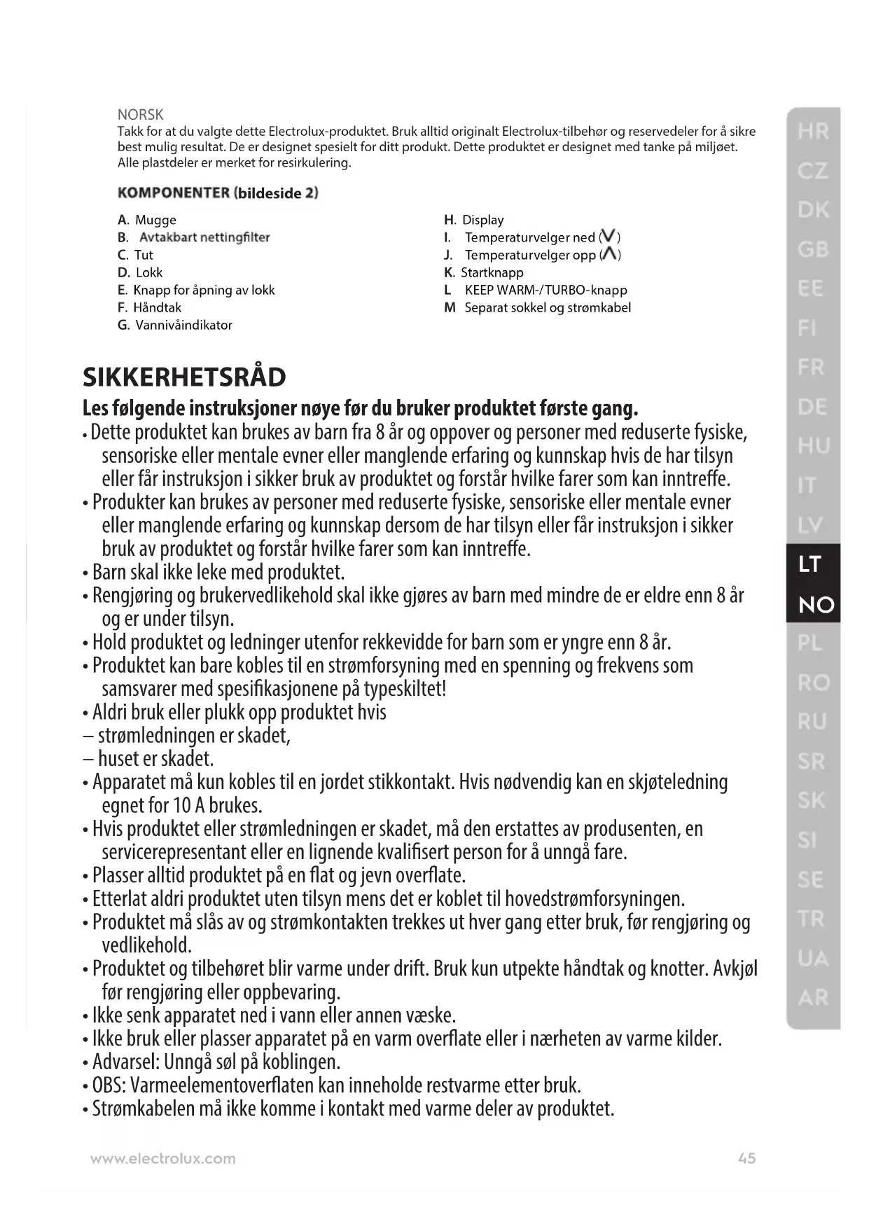 J. Temperaturvelger opp ( ) K. Startknapp L KEEP WARM-/TURBO-knapp M Separat sokkel og strømkabel SIKKERHETSRÅD Les følgende instruksjoner nøye før du bruker produktet første gang.