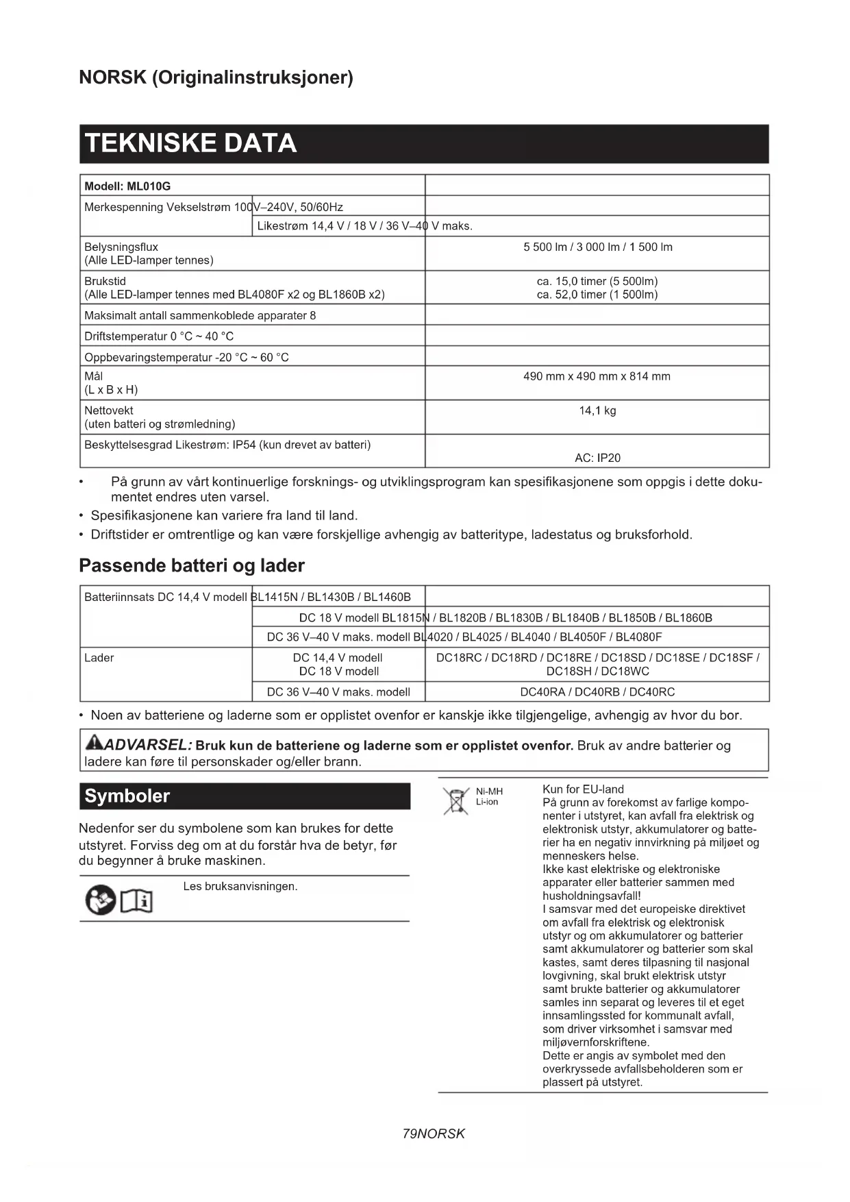 - Noen av batteriene og laderne som er opplistet ovenfor er kanskje ikke tilgjengelige, avhengig av hvor du bor. ADVARSEL: Bruk kun de batteriene og laderne som er opplistet ovenfor. Bruk av andre batterier og ladere kan føre til personskader og/eller brann. Symboler Nedenfor ser du symbolene som kan brukes for dette utstyret. Forviss deg om at du forstår hva de betyr, før du begynner å bruke maskinen. Les bruksanvisningen. Ni-MH Li-ion Kun for EU-land På grunn av forekomst av farlige kompo- nenter i utstyret, kan avfall fra elektrisk og elektronisk utstyr, akkumulatorer og batte- rier ha en negativ innvirkning på miljøet og menneskers helse. Ikke kast elektriske og elektroniske apparater eller batterier sammen med husholdningsavfall! I samsvar med det europeiske direktivet om avfall fra elektrisk og elektronisk utstyr og om akkumulatorer og batterier samt akkumulatorer og batterier som skal kastes, samt deres tilpasning til nasjonal lovgivning, skal brukt elektrisk utstyr samt brukte batterier og akkumulatorer samles inn separat og leveres til et eget innsamlingssted for kommunalt avfall, som driver virksomhet i samsvar med miljøvernforskriftene. Dette er angis av symbolet med den overkryssede avfallsbeholderen som er plassert på utstyret.80 NORSK Vær spesielt forsiktig og oppmerksom.Optisk stråling (UV og IR).Minimer eksponering av øyne og hud.Ikke stirre på driftslampen.Bruk egnet skjerming eller vernebriller.Ikke bruk apparatet i regn eller snø, under våte forhold eller forhold med høy luftfuktig-het når det er koblet til strømnettet.Omstartsknapp for bryter. Merknad Dette produktet inneholder lyskilder med energieektivi- tetsklassene <C> og <D>. Strømforsyning Maskinen må bare kobles til en strømkilde med samme spenning som vist på typeskiltet, og kan bare brukes med enfase-vekselstrømforsyning. Dette verktøyet må være jordet når det brukes, for å beskytte operatøren mot elektrisk støt. Bruk kun treleders skjøteledninger med jordingsstøpsler med tre tenner, og trepolede kontakter som passer til verktøyets støpsel. SIKKERHETSADVARSEL VIKTIGE SIKKERHETSANVISNINGER ADVARSEL: Les alle sikkerhetsadvarslene og alle instruksjonene. Hvis du ikke følger alle advars- lene og instruksjonene som er oppført nedenfor, kan det føre til elektriske støt, brann og/eller alvorlige helseskader.
