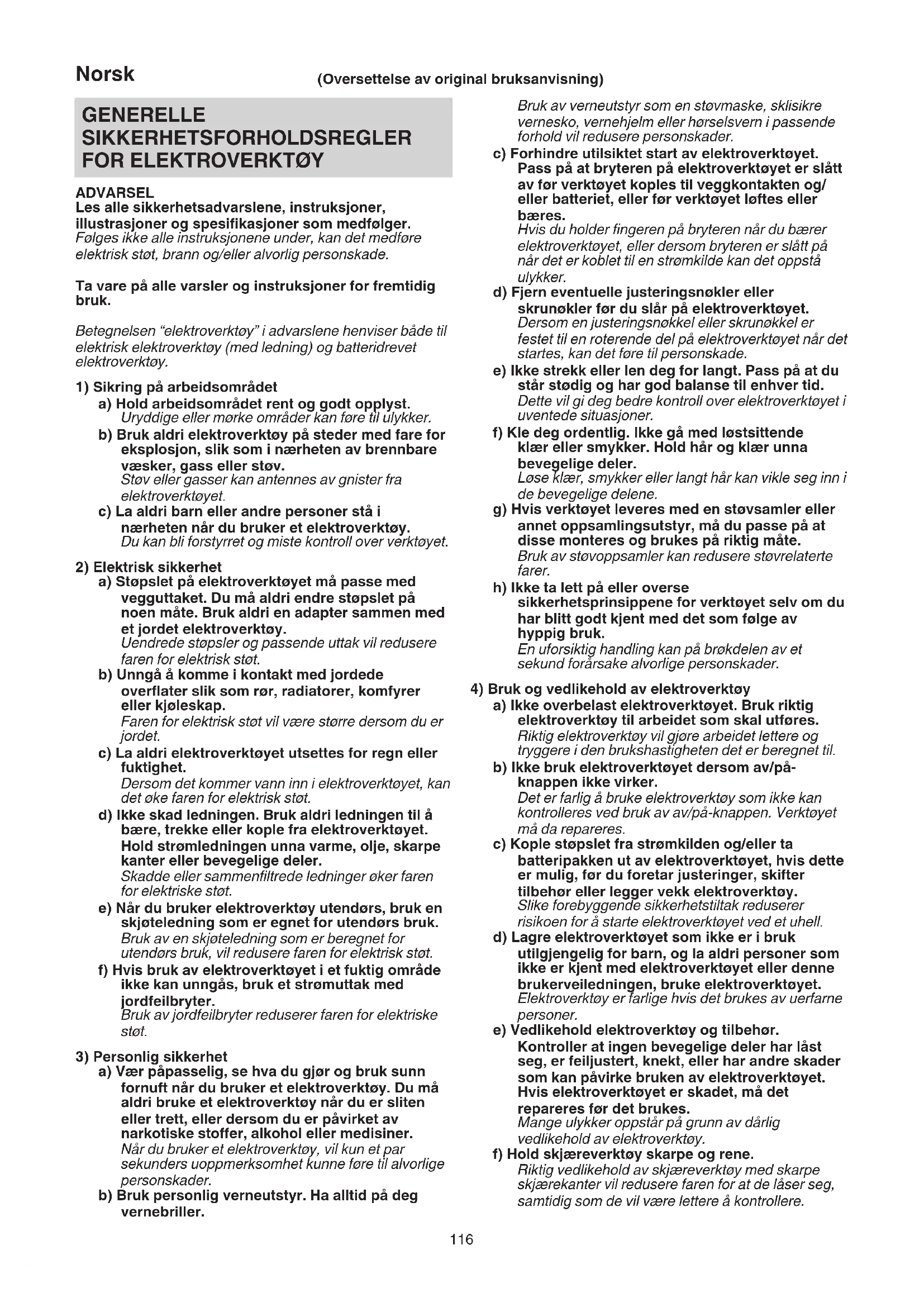ADVARSEL Les alle sikkerhetsadvarslene, instruksjoner, illustrasjoner og spesifikasjoner som medfølger. Følges ikke alle instruksjonene under, kan det medføre elektrisk støt, brann og/eller alvorlig personskade. Ta vare på alle varsler og instruksjoner for fremtidig bruk. Betegnelsen “elektroverktøy” i advarslene henviser både til elektrisk elektroverktøy (med ledning) og batteridrevet elektroverktøy.