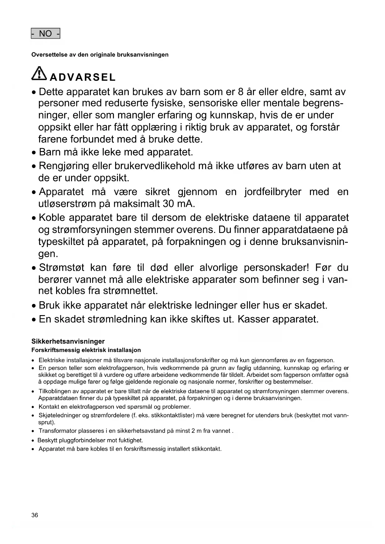 - Strømstøt kan føre til død eller alvorlige personskader! Før du berører vannet må alle elektriske apparater som befinner seg i van- net kobles fra strømnettet.