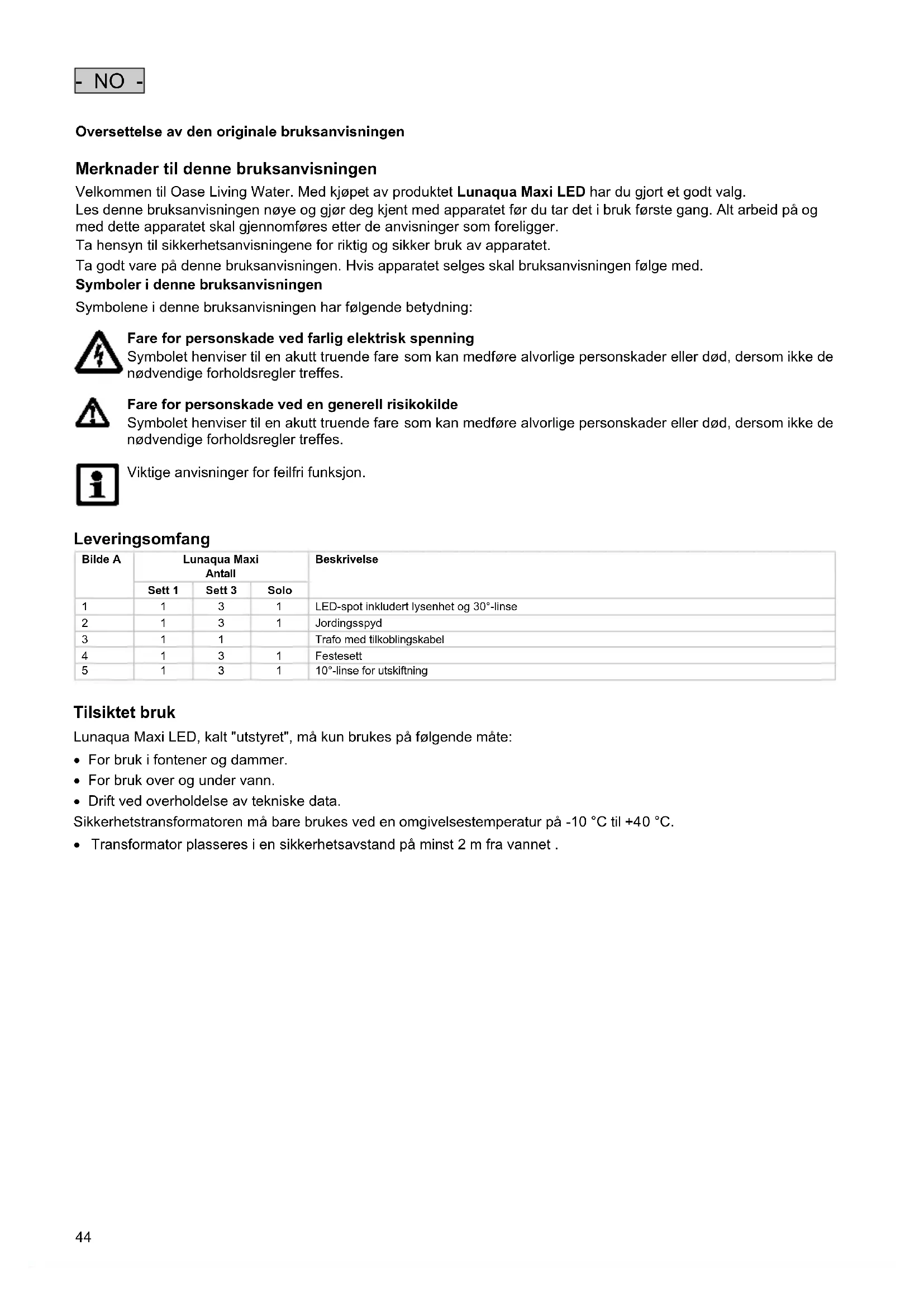 Merknader til denne bruksanvisningen Velkommen til Oase Living Water. Med kjøpet av produktet Lunaqua Maxi LED har du gjort et godt valg. Les denne bruksanvisningen nøye og gjør deg kjent med apparatet før du tar det i bruk første gang. Alt arbeid på og med dette apparatet skal gjennomføres etter de anvisninger som foreligger. Ta hensyn til sikkerhetsanvisningene for riktig og sikker bruk av apparatet. Ta godt vare på denne bruksanvisningen. Hvis apparatet selges skal bruksanvisningen følge med. Symboler i denne bruksanvisningen