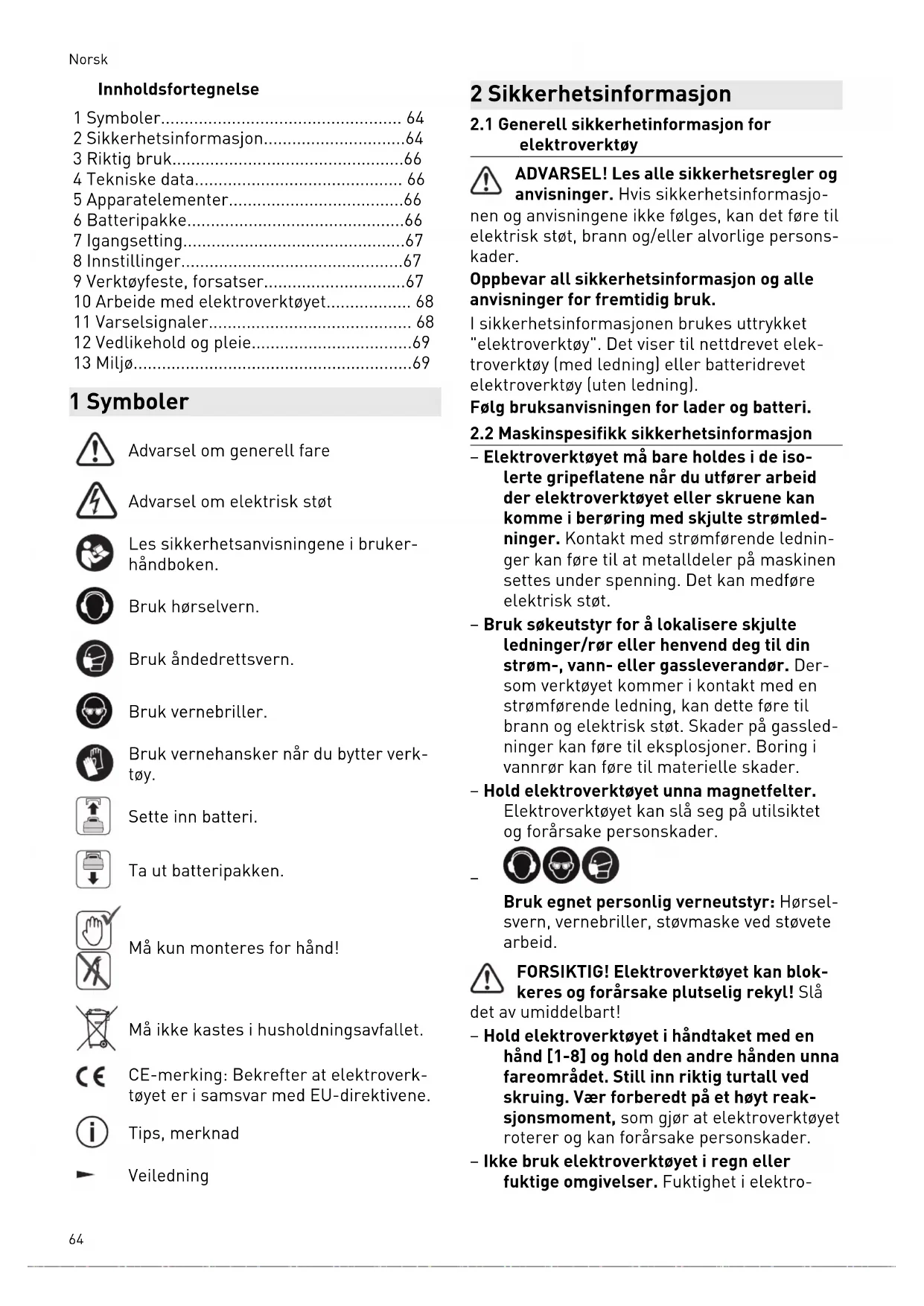 elektroverktøy ADVARSEL! Les alle sikkerhetsregler og anvisninger. Hvis sikkerhetsinformasjo nen og anvisningene ikke følges, kan det føre til elektrisk støt, brann og/eller alvorlige persons kader. Oppbevar all sikkerhetsinformasjon og alle anvisninger for fremtidig bruk. I sikkerhetsinformasjonen brukes uttrykket "elektroverktøy". Det viser til nettdrevet elek troverktøy (med ledning) eller batteridrevet elektroverktøy (uten ledning). Følg bruksanvisningen for lader og batteri.