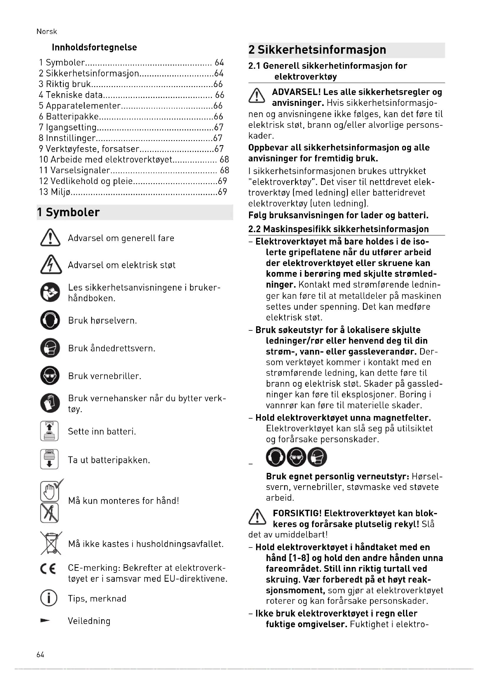 Bruk egnet personlig verneutstyr: Hørsel svern, vernebriller, støvmaske ved støvete arbeid. FORSIKTIG! Elektroverktøyet kan blok keres og forårsake plutselig rekyl! Slå det av umiddelbart! – Hold elektroverktøyet i håndtaket med en hånd [1-8] og hold den andre hånden unna fareområdet. Still inn riktig turtall ved skruing. Vær forberedt på et høyt reak sjonsmoment, som gjør at elektroverktøyet roterer og kan forårsake personskader. – Ikke bruk elektroverktøyet i regn eller fuktige omgivelser. Fuktighet i elektro Norsk 64verktøyet kan medføre kortslutning og brann. – Vent til elektroverktøyet har stanset før du legger det fra deg. Innsatsverktøyet kan feste seg og føre til at du mister kontrollen over elektroverktøyet. – Unngå at maskinen slås på utilsiktet. Ikke bær elektroverktøyet med fingeren på av/på-bryteren. Dette kan føre til ulykker. Når du ikke bruker elektroverktøyet, skal du sette bryteren for transportlås [1-7] i midtstilling. – Betjeningselementene, f.eks. av/på-bryte ren, må ikke manipuleres eller blokkeres. – Bruk kun de batteripakkene som er be regnet til formålet, og ikke bruk strøma daptere til dette batteridrevne elektro verktøyet. Ikke lad batteripakken med la dere fra andre produsenter. Bruker du til behør som ikke er godkjent av produsen ten, kan dette føre til elektrisk støt og/eller alvorlige ulykker. – Advarsel om skadelig lysstråling. Ik ke se inn i lysstrålen over lengre tid. Ikke rett lysstrålen mot andre personer eller dyr. Den optiske strålingen kan være ska delig for øynene - [4]. – Bruk støvoppsuging ved arbeid som fører til støvutvikling. – Ikke bruk innsatsverktøy og tilbehør som ikke er blitt utviklet eller anbefalt spesielt for dette elektroverktøyet av produsen ten. Selv om tilbehøret eller innsatsverk tøyet lar seg feste på elektroverktøyet, ga ranterer ikke dette sikker bruk. Det kan oppstå økt risiko for personskader samt slitasje på elektroverktøyet, og kvaliteten på arbeidsresultatene kan forringes. – Alt etter typen av tilbehør og hvordan det brukes, kan partikler, innsatsverktøyet og deler av innsatsverktøyet løsne. Det kan oppstå økt støvbelastning og uventede be vegelser. Bruk egnet personlig verneut styr. Vær forberedt på et høyt reaksjons moment, som gjør at elektroverktøyet rote rer og kan forårsake personskader.