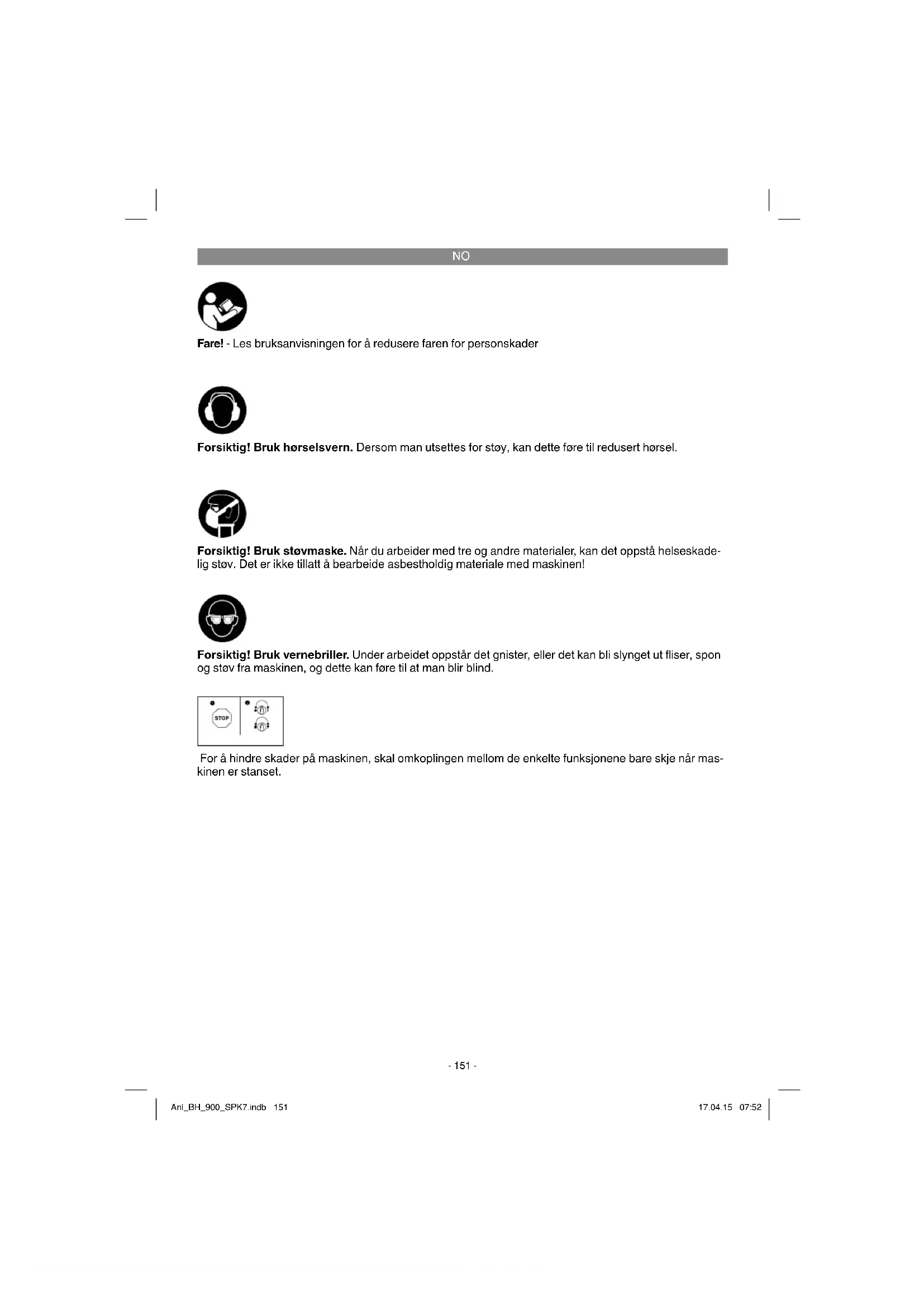 Fare! - Les bruksanvisningen for å redusere faren for personskader Forsiktig! Bruk hørselsvern. Dersom man utsettes for støy, kan dette føre til redusert hørsel. Forsiktig! Bruk vernebriller. Under arbeidet oppstår det gnister, eller det kan bli slynget ut fl iser, spon og støv fra maskinen, og dette kan føre til at man blir blind. Forsiktig! Bruk støvmaske. Når du arbeider med tre og andre materialer, kan det oppstå helseskade- lig støv. Det er ikke tillatt å bearbeide asbestholdig materiale med maskinen! For å hindre skader på maskinen, skal omkoplingen mellom de enkelte funksjonene bare skje når mas- kinen er stanset. Anl_BH_900_SPK7.indb 151Anl_BH_900_SPK7.indb 151 17.04.15 07:5217.04.15 07:52NO