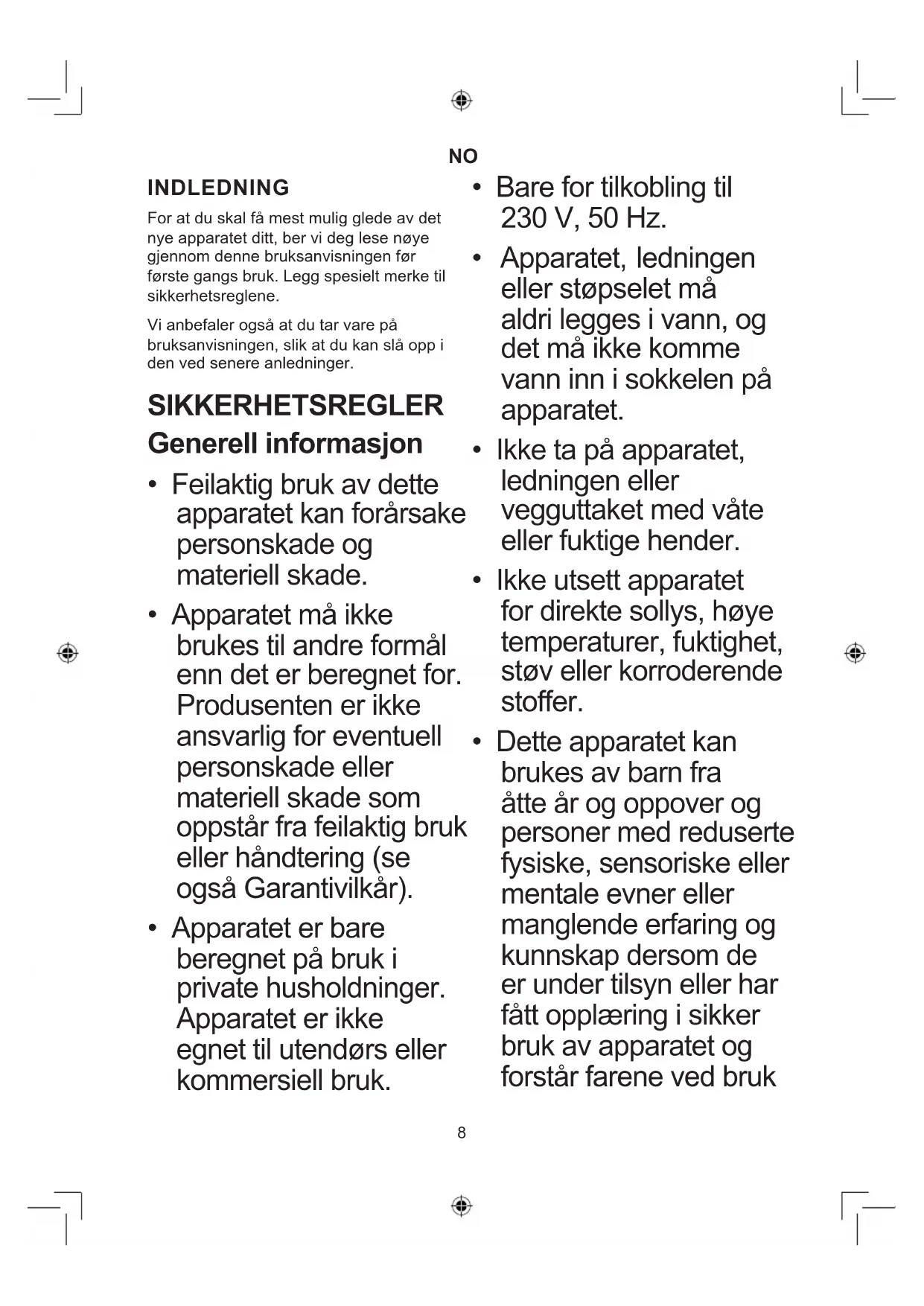 INDLEDNING For at du skal få mest mulig glede av det nye apparatet ditt, ber vi deg lese nøye gjennom denne bruksanvisningen før første gangs bruk. Legg spesielt merke til sikkerhetsreglene. Vi anbefaler også at du tar vare på bruksanvisningen, slik at du kan slå opp i den ved senere anledninger. SIKKERHETSREGLER Generell informasjon