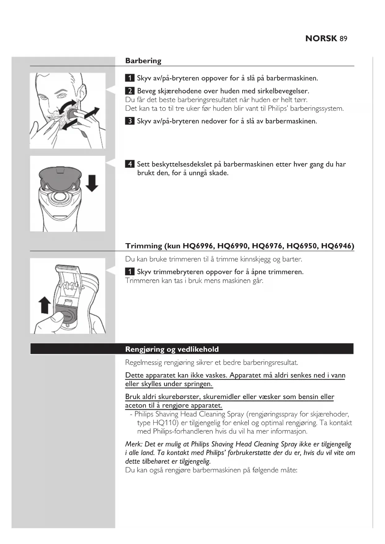 Fullad barbermaskinen og bruk den normalt helt til batteriet er utladet. Gjenta denne fremgangsmåten to ganger til. Hvis du optimaliserer batterikapasiteten på denne måten, kan du også lade barbermaskinen mellom barberingene, selv om batteriet ikke er helt utladet. Lade barbermaskinen (kun HQ6996, HQ6990, HQ6986, HQ6976, HQ6950, HQ6947, HQ6927, HQ6926, HQ6925, HQ6923) Hurtiglading (kun HQ6996, HQ6990, HQ6986) Når barbermaskinen er ladet i tre minutter, har den nok strøm til én trådløs barbering. Lade med adapteren 1 Koble ledningen til barbermaskinen. 2 Sett støpselet i stikkontakten. Merk: Kontroller at apparatet er slått av. , Ladelampen tennes. , HQ6996, HQ6990, HQ6986: Lad barbermaskinen i minst én time, men ikke mer enn 24 timer. Når batteriet er fulladet, begynner ladelampen å blinke. , HQ6976, HQ6950, HQ6947, HQ6927, HQ6926, HQ6925, HQ6923: Lad barbermaskinen i minst åtte timer, men ikke i mer enn 24 timer. Ladelampen lyser så lenge apparatet er koblet til strømnettet. Merk: Ikke la barbermaskinen være koblet til strømnettet hele tiden. Merk: Du kan også barbere deg uten å lade barbermaskinen. Du trenger bare å koble den til strømnettet. 3 Fjern støpslet fra stikkontakten og trekk ut ledningen fra apparatet når batteriet er fulladet. Bruke apparatet Bare HQ6996, HQ6990, HQ6986, HQ6976, HQ6950, HQ6947, HQ6927, HQ6926, HQ6925, HQ6923: Du kan bruke barbermaskinen direkte på strømnettet, eller du kan bruke den uten ledning. HQ6946, HQ6906, HQ6902: Du kan bare bruke barbermaskinen direkte på strømnettet. Før bruk (bare HQ6946, HQ6906, HQ6902) 1 Koble ledningen til barbermaskinen. 2 Sett støpselet i stikkontakten. NORSK88Barbering 1 Skyv av/på-bryteren oppover for å slå på barbermaskinen. 2 Beveg skjærehodene over huden med sirkelbevegelser. Du får det beste barberingsresultatet når huden er helt tørr. Det kan ta to til tre uker før huden blir vant til Philips’ barberingssystem. 3 Skyv av/på-bryteren nedover for å slå av barbermaskinen. 4 Sett beskyttelsesdekslet på barbermaskinen etter hver gang du har brukt den, for å unngå skade. Trimming (kun HQ6996, HQ6990, HQ6976, HQ6950, HQ6946) Du kan bruke trimmeren til å trimme kinnskjegg og barter. 1 Skyv trimmebryteren oppover for å åpne trimmeren. Trimmeren kan tas i bruk mens maskinen går. Rengjøring og vedlikehold Regelmessig rengjøring sikrer et bedre barberingsresultat. Dette apparatet kan ikke vaskes. Apparatet må aldri senkes ned i vann eller skylles under springen. Bruk aldri skurebørster, skuremidler eller væsker som bensin eller aceton til å rengjøre apparatet. - Philips Shaving Head Cleaning Spray (rengjøringsspray for skjærehoder, type HQ110) er tilgjengelig for enkel og optimal rengjøring. Ta kontakt med Philips-forhandleren hvis du vil ha mer informasjon. Merk: Det er mulig at Philips Shaving Head Cleaning Spray ikke er tilgjengelig i alle land. Ta kontakt med Philips’ forbrukerstøtte der du er, hvis du vil vite om dette tilbehøret er tilgjengelig. Du kan også rengjøre barbermaskinen på følgende måte: NORSK 89Hver uke: skjæreenhet og skjeggkammer 1 Slå av barbermaskinen, ta støpselet ut av stikkontakten og trekk ledningen ut av barbermaskinen. 2 Rengjør den øverste delen av barbermaskinen først, ved hjelp av rengjøringsbørsten som følger med. 3 Trykk på utløserknappen (1) og ta av skjæreenheten (2). 4 Rengjør innsiden av skjæreenheten og skjeggkammeret med rengjøringsbørsten. 5 Sett skjæreenheten tilbake på maskinen. Hver måned: skjærehoder 1 Slå av barbermaskinen, ta støpselet ut av stikkontakten og trekk ledningen ut av barbermaskinen. 2 Trykk på utløserknappen (1) og ta av skjæreenheten (2).