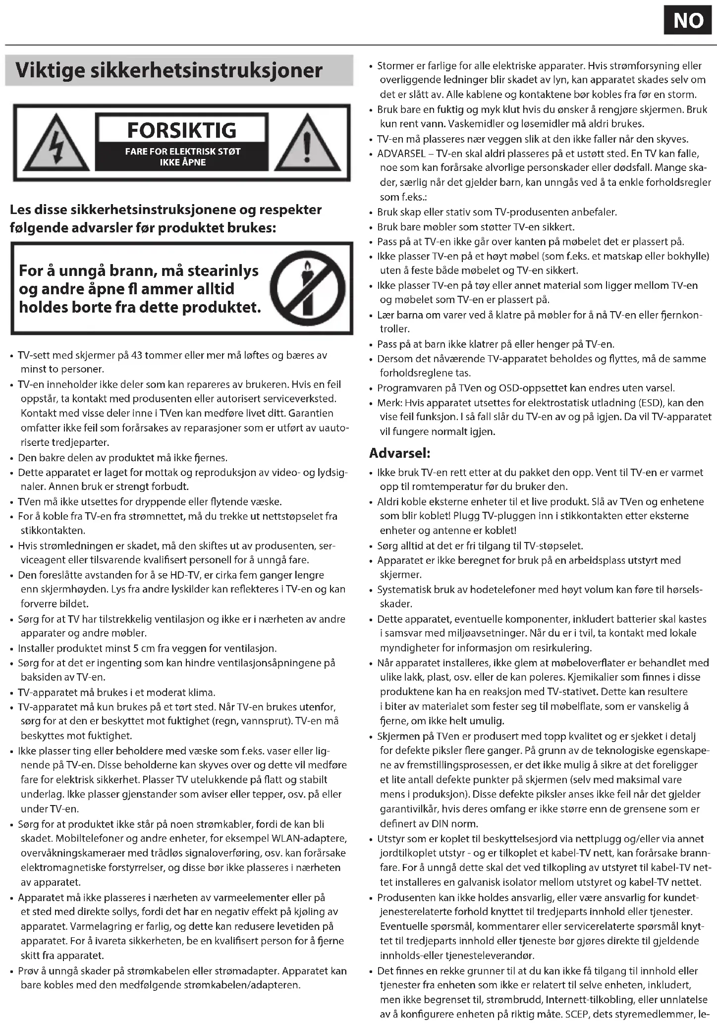 - ADVARSEL – TV-en skal aldri plasseres på et ustøtt sted. En TV kan falle, noe som kan forårsake alvorlige personskader eller dødsfall. Mange ska- der, særlig når det gjelder barn, kan unngås ved å ta enkle forholdsregler som f.eks.: