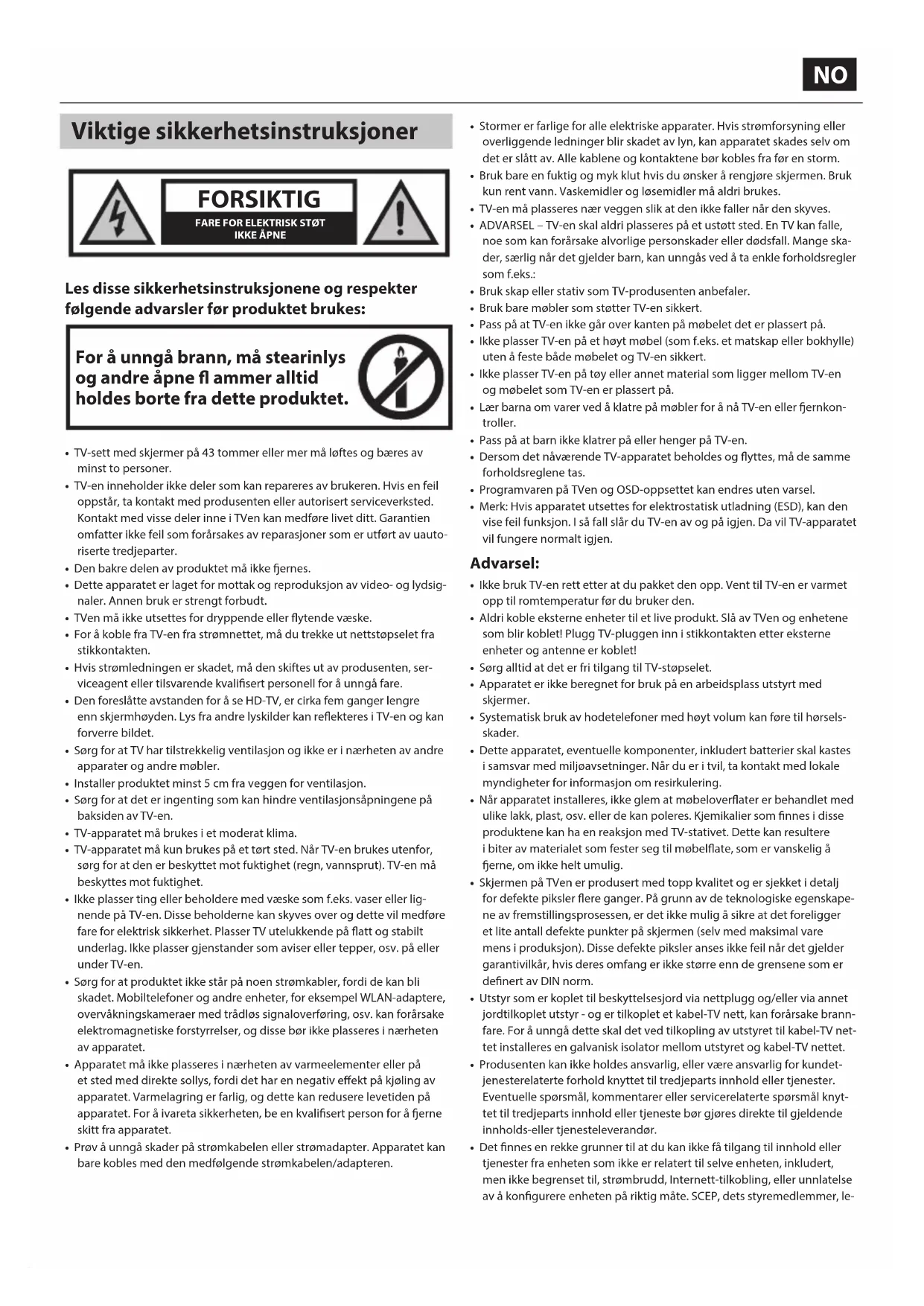 - ADVARSEL – TV-en skal aldri plasseres på et ustøtt sted. En TV kan falle, noe som kan forårsake alvorlige personskader eller dødsfall. Mange ska- der, særlig når det gjelder barn, kan unngås ved å ta enkle forholdsregler som f.eks.: