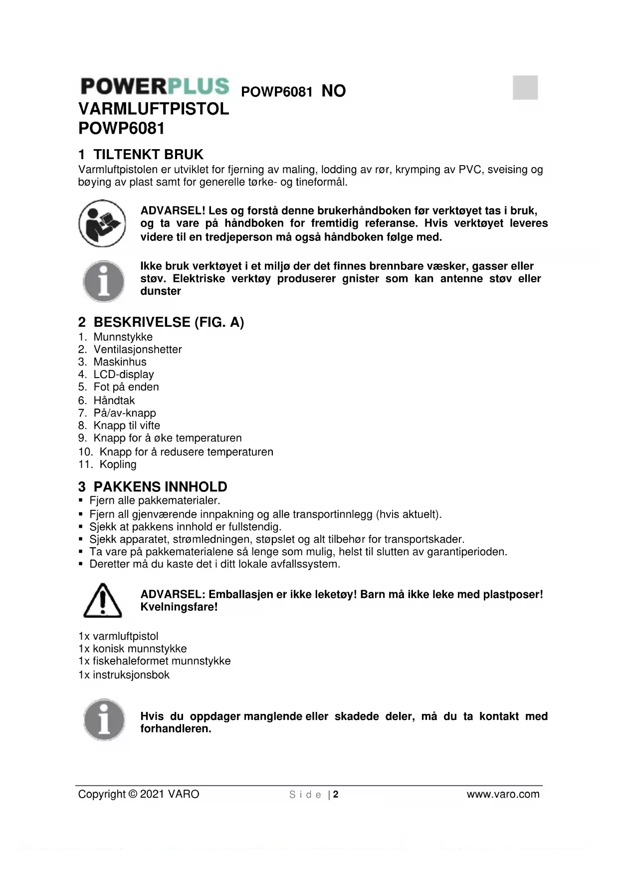 Copyright © 2021 VARO S i d e | 2 www.varo.com VARMLUFTPISTOL POWP6081 1 TILTENKT BRUK Varmluftpistolen er utviklet for fjerning av maling, lodding av rør, krymping av PVC, sveising og bøying av plast samt for generelle tørke- og tineformål. ADVARSEL! Les og forstå denne brukerhåndboken før verktøyet tas i bruk, og ta vare på håndboken for fremtidig referanse. Hvis verktøyet leveres videre til en tredjeperson må også håndboken følge med. Ikke bruk verktøyet i et miljø der det finnes brennbare væsker, gasser eller støv. Elektriske verktøy produserer gnister som kan antenne støv eller dunster 2 BESKRIVELSE (FIG. A)