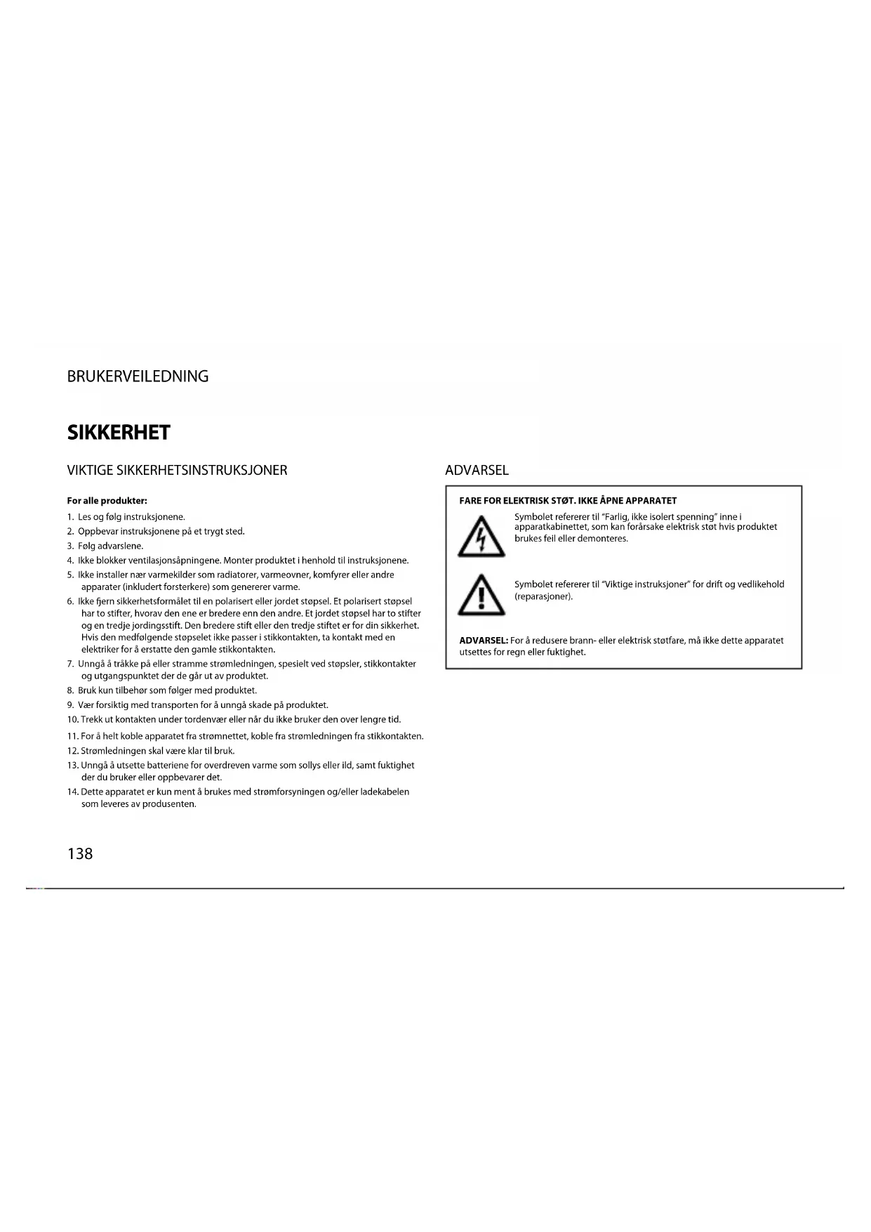 som leveres av produsenten. ADVARSEL FARE FOR ELEKTRISK STØT. IKKE ÅPNE APPARATET Symbolet refererer til “Farlig, ikke isolert spenning” inne i apparatkabinettet, som kan forårsake elektrisk støt hvis produktet brukes feil eller demonteres. Symbolet refererer til “Viktige instruksjoner” for drift og vedlikehold (reparasjoner). ADVARSEL: For å redusere brann- eller elektrisk støtfare, må ikke dette apparatet utsettes for regn eller fuktighet.NORSK