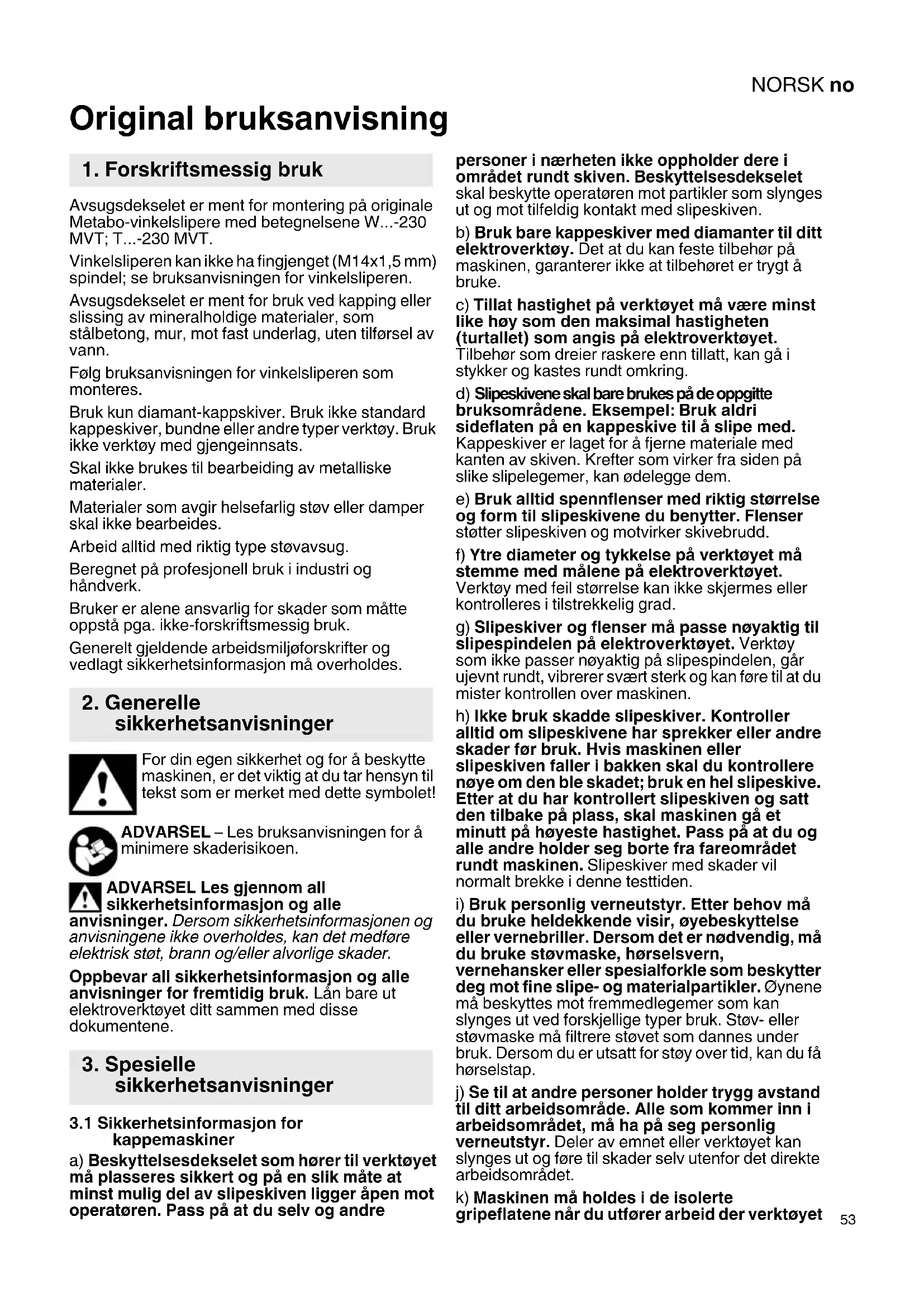 Original bruksanvisning Avsugsdekselet er ment for montering på originale Metabo-vinkelslipere med betegnelsene W...-230 MVT; T...-230 MVT. Vinkelsliperen kan ikke ha fingjenget (M14x1,5 mm) spindel; se bruksanvisningen for vinkelsliperen. Avsugsdekselet er ment for bruk ved kapping eller slissing av mineralholdige materialer, som stålbetong, mur, mot fast underlag, uten tilførsel av vann. Følg bruksanvisningen for vinkelsliperen som monteres. Bruk kun diamant-kappskiver. Bruk ikke standard kappeskiver, bundne eller andre typer verktøy. Bruk ikke verktøy med gjengeinnsats. Skal ikke brukes til bearbeiding av metalliske materialer. Materialer som avgir helsefarlig støv eller damper skal ikke bearbeides. Arbeid alltid med riktig type støvavsug. Beregnet på profesjonell bruk i industri og håndverk. Bruker er alene ansvarlig for skader som måtte oppstå pga. ikke-forskriftsmessig bruk. Generelt gjeldende arbeidsmiljøforskrifter og vedlagt sikkerhetsinformasjon må overholdes. For din egen sikkerhet og for å beskytte maskinen, er det viktig at du tar hensyn til tekst som er merket med dette symbolet! ADVARSEL – Les bruksanvisningen for å minimere skaderisikoen. ADVARSEL Les gjennom all sikkerhetsinformasjon og alle anvisninger. Dersom sikkerhetsinformasjonen og anvisningene ikke overholdes, kan det medføre elektrisk støt, brann og/eller alvorlige skader. Oppbevar all sikkerhetsinformasjon og alle anvisninger for fremtidig bruk. Lån bare ut elektroverktøyet ditt sammen med disse dokumentene.