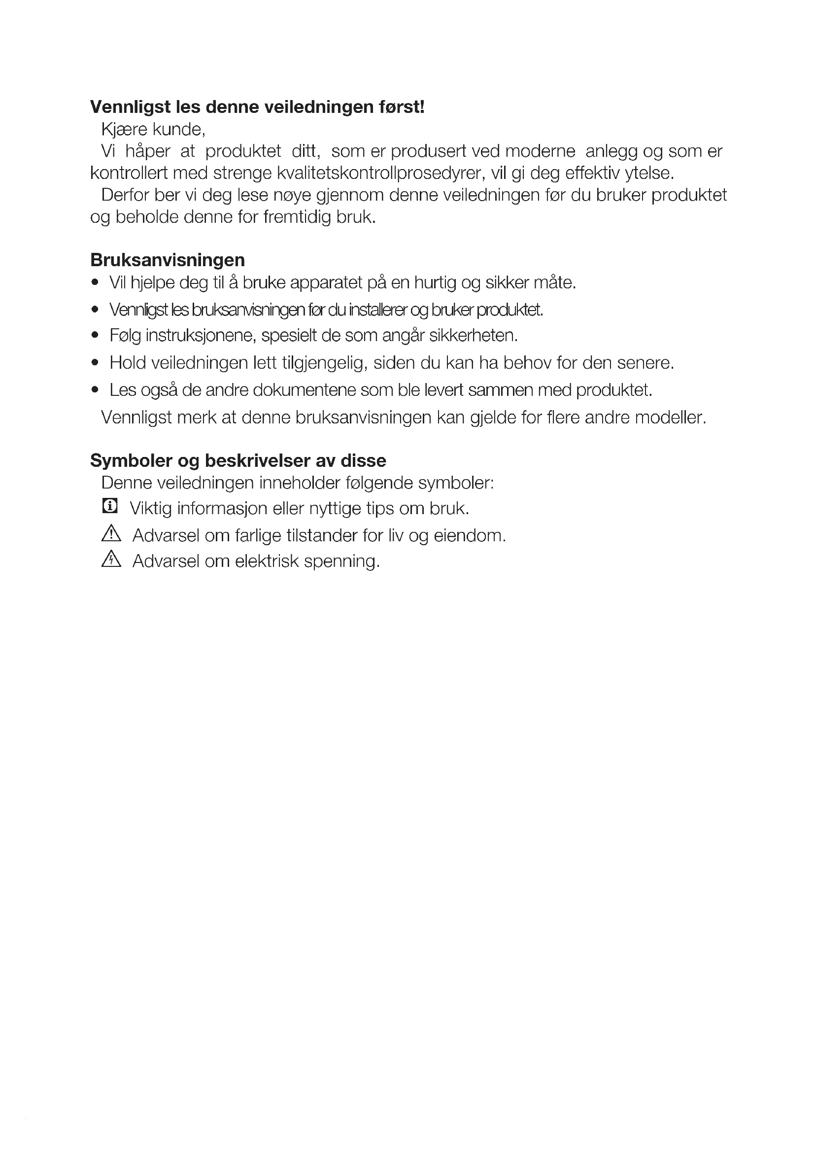 - Les også de andre dokumentene som ble levert sammen med produktet. Vennligst merk at denne bruksanvisningen kan gjelde for flere andre modeller. Symboler og beskrivelser av disse Denne veiledningen inneholder følgende symboler: C Viktig informasjon eller nyttige tips om bruk. A Advarsel om farlige tilstander for liv og eiendom. B Advarsel om elektrisk spenning.NO