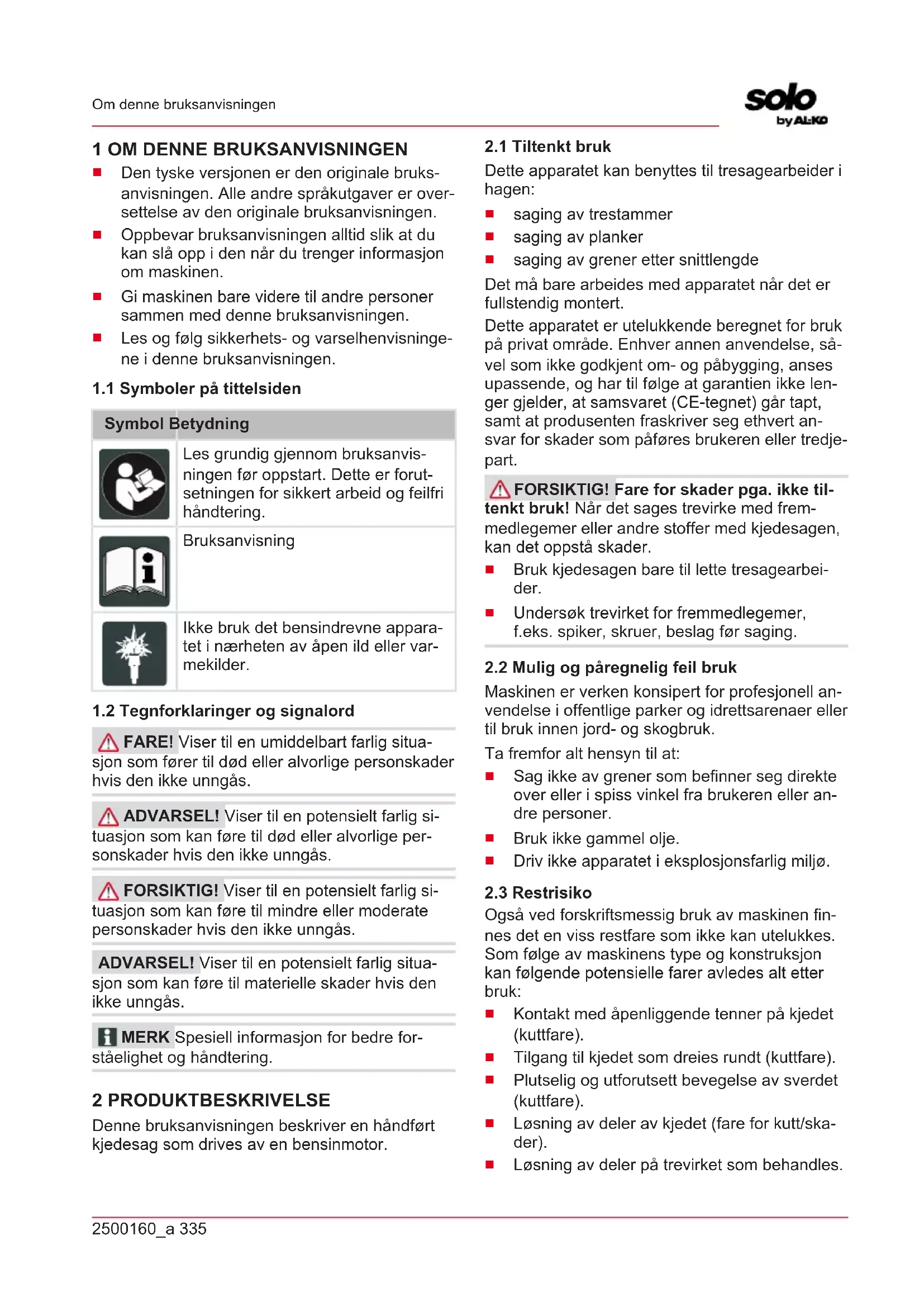 FARE! Viser til en umiddelbart farlig situa- sjon som fører til død eller alvorlige personskader hvis den ikke unngås. ADVARSEL! Viser til en potensielt farlig si- tuasjon som kan føre til død eller alvorlige per- sonskader hvis den ikke unngås. FORSIKTIG! Viser til en potensielt farlig si- tuasjon som kan føre til mindre eller moderate personskader hvis den ikke unngås. ADVARSEL! Viser til en potensielt farlig situa- sjon som kan føre til materielle skader hvis den ikke unngås. MERK Spesiell informasjon for bedre for- ståelighet og håndtering. 2 PRODUKTBESKRIVELSE Denne bruksanvisningen beskriver en håndført kjedesag som drives av en bensinmotor.