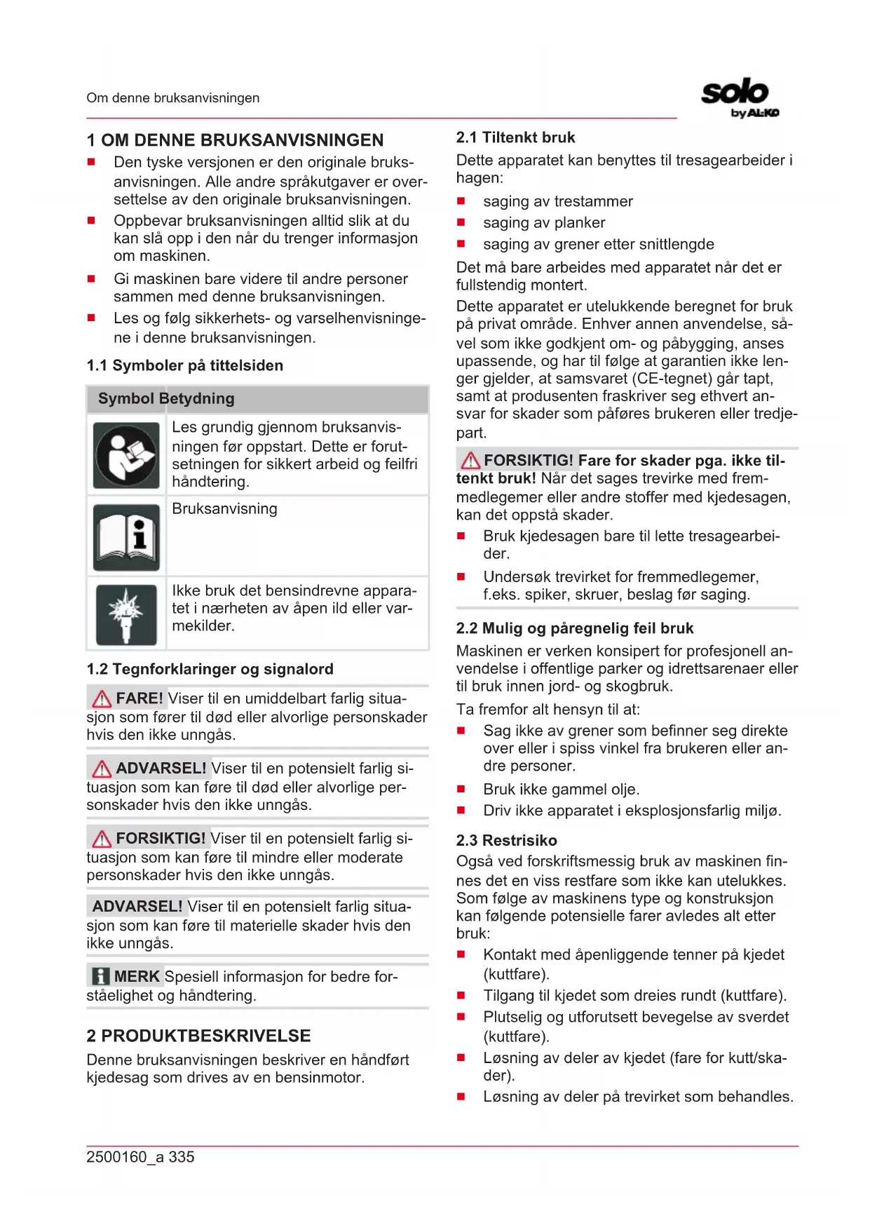 FARE! Viser til en umiddelbart farlig situa- sjon som fører til død eller alvorlige personskader hvis den ikke unngås. ADVARSEL! Viser til en potensielt farlig si- tuasjon som kan føre til død eller alvorlige per- sonskader hvis den ikke unngås. FORSIKTIG! Viser til en potensielt farlig si- tuasjon som kan føre til mindre eller moderate personskader hvis den ikke unngås. ADVARSEL! Viser til en potensielt farlig situa- sjon som kan føre til materielle skader hvis den ikke unngås. MERK Spesiell informasjon for bedre for- ståelighet og håndtering. 2 PRODUKTBESKRIVELSE Denne bruksanvisningen beskriver en håndført kjedesag som drives av en bensinmotor.
