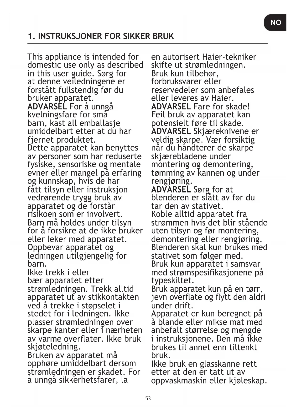 - Du behøver ikke at spekulere på om der løber væske ind i hovedkroppen, eftersom den har en indbygget dræntank. DK53 This appliance is intended for domestic use only as described in this user guide. Sørg for at denne veiledningene er forstått fullstendig før du bruker apparatet. ADVARSEL For å unngå kvelningsfare for små barn, kast all emballasje umiddelbart etter at du har fjernet produktet. Dette apparatet kan benyttes av personer som har reduserte fysiske, sensoriske og mentale evner eller mangel på erfaring og kunnskap, hvis de har fått tilsyn eller instruksjon vedrørende trygg bruk av apparatet og de forstår risikoen som er involvert. Barn må holdes under tilsyn for å forsikre at de ikke bruker eller leker med apparatet. Oppbevar apparatet og ledningen utilgjengelig for barn. Ikke trekk i eller bær apparatet etter strømledningen. Trekk alltid apparatet ut av stikkontakten ved å trekke i støpselet i stedet for i ledningen. Ikke plasser strømledningen over skarpe kanter eller i nærheten av varme overater. Ikke bruk skjøteledning. Bruken av apparatet må opphøre umiddelbart dersom strømledningen er skadet. For å unngå sikkerhetsfarer, la en autorisert Haier-tekniker skifte ut strømledningen. Bruk kun tilbehør, forbruksvarer eller reservedeler som anbefales eller leveres av Haier. ADVARSEL Fare for skade! Feil bruk av apparatet kan potensielt føre til skade. ADVARSEL Skjæreknivene er veldig skarpe. Vær forsiktig når du håndterer de skarpe skjærebladene under montering og demontering, tømming av kannen og under rengjøring. ADVARSEL Sørg for at blenderen er slått av før du tar den av stativet. Koble alltid apparatet fra strømmen hvis det blir stående uten tilsyn og før montering, demontering eller rengjøring. Blenderen skal kun brukes med stativet som følger med. Bruk kun apparatet i samsvar med strømspesikasjonene på typeskiltet. Bruk apparatet kun på en tørr, jevn overate og ytt den aldri under drift. Apparatet er kun beregnet på å blande eller mikse mat med anbefalt størrelse og mengde i instruksjonene. Den må ikke brukes til annet enn tiltenkt bruk. Ikke bruk en glasskanne rett etter at den er tatt ut av oppvaskmaskin eller kjøleskap.