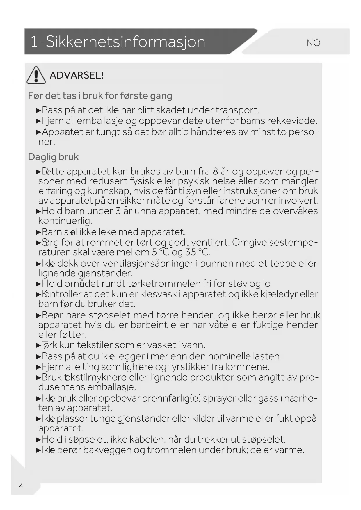 ADVARSEL! Før det tas i bruk for første gang ▶ Pass på at det ikk e har blitt skadet under transport. ▶ Fjern all emballasje og oppbevar det te utenfor barns rekkevidde. ▶ Appar atet er tungt så det bør alltid håndteres av minst to perso- ner. Daglig bruk ▶ D ette apparatet kan brukes av barn fra 8 år og oppover og per- soner med redusert fysisk eller psykisk helse eller som mangler erfaring og kunnskap, hvis de får tilsyn eller instruksjoner om bruk av apparatet på en sikker måte og forstår farene som er involvert. ▶ Hold barn under 3 år unna appar atet, med mindre de overvåkes kontinuerlig. ▶ Barn sk al ikke leke med apparatet. ▶ S ørg for at rommet er tørt og godt ventilert. Omgivelsestempe- raturen skal være mellom 5 °C og 35 °C. ▶ Ikk e dekk over ventilasjonsåpninger i bunnen med et teppe eller lignende gjenstander. ▶ Hold omr ådet rundt tørketrommelen fri for støv og lo ▶ K ontroller at det kun er klesvask i apparatet og ikke kjæledyr eller barn før du bruker det. ▶ Ber ør bare støpselet med tørre hender, og ikke berør eller bruk apparatet hvis du er barbeint eller har våte eller fuktige hender eller føtter. ▶ T ørk kun tekstiler som er vasket i vann. ▶ Pass på at du ikk e legger i mer enn den nominelle lasten. ▶ Fjern alle ting som light ere og fyrstikker fra lommene. ▶ Bruk t ekstilmyknere eller lignende produkter som angitt av pro- dusentens emballasje. ▶ Ikk e bruk eller oppbevar brennfarlig(e) sprayer eller gass i nærhe- ten av apparatet. ▶ Ikk e plasser tunge gjenstander eller kilder til varme eller fukt oppå apparatet. ▶ Hold i st øpselet, ikke kabelen, når du trekker ut støpselet. ▶ Ikk e berør bakveggen og trommelen under bruk; de er varme.NO
