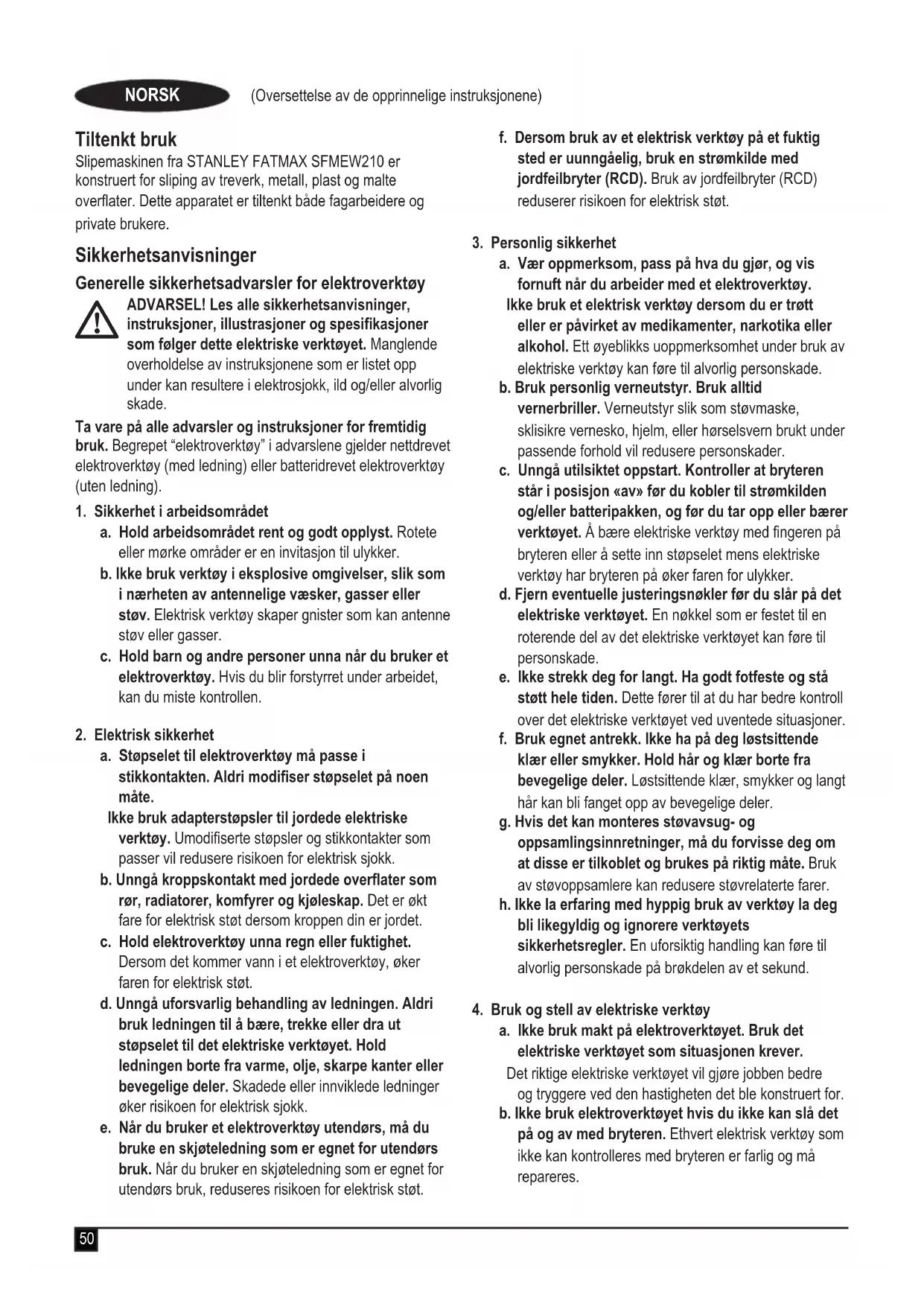 Tilbehør Hvilket tilbehør som følger med slipemaskinen, avhenger av modellen du har kjøpt. Alt tilbehøret som er oppgitt nedenfor, er tilgjengelig i vår serie. Hvis du ønsker tilbehør som er oppgitt nedenfor, men som ikke følger med slipemaskinen, kan du gå til våre nettsider på www.stanleyfatmax.eu. Verktøyets ytelse avhenger av hva slags tilbehør som brukes. Stanley Fat Max-tilbehør er produsert etter høye kvalitetsstandarder og er konstruert for å bedre verktøyets ytelse. Hvis du bruker dette tilbehøret, får du mest mulig ut av verktøyet ditt. Advarsel! Bruk av annet tilleggsutstyr enn det som tilbys av STANLEY FAT MAX kan være farlig, ettersom dette ikke er testet sammen med dette verktøyet. For å redusere risiko for personskade, bruk bare anbefalt tilbehør fra STANLEY FATMAX med dette produktet. Artikkel Beskrivelse Slipepapir med kornstørrelse 240. For n overate og sliping av store detaljer. (Artikkelnummer - N238135) Slipepapir med kornstørrelse 120. For middels n overate og sliping av store detaljer. (Artikkelnummer - N238134) Slipepapir med kornstørrelse 80. For grov overate og sliping av store detaljer. (Artikkelnummer - N238133) Slipepapir med kornstørrelse 240 for sliping av store detaljer – med to ekstra spisser. For n overate og sliping av store detaljer. (Artikkelnummer - ITM90531998-05) Slipepapir med kornstørrelse 120 for sliping av store detaljer – med to ekstra spisser. For middels n overate og sliping av store detaljer. (Artikkelnummer - ITM90531998-03) Slipepapir med kornstørrelse 60 for sliping av store detaljer – med to ekstra spisser. For grov overate og sliping av store detaljer. (Artikkelnummer - ITM90531998-01)53 (Oversettelse av de opprinnelige instruksjonene) NORSK Artikkel Beskrivelse Slipepapir med kornstørrelse 120 for detaljngersliping. For middels n overate og sliping av detaljer. (Delenummer - 470878-01) Montering Advarsel! Før montering, pass på at verktøyet er slått av og at strømstøpselet på kabelen er tatt ut av stikkontakten. Sette på slipepapir (gur A) ● Hold verktøyet med slipebasen vendt oppover. ● Legg slipepapiret (8) på slipebasen. Pass på at hullene i slipepapiret ligger rett over hullene i basen. Sette på slipepapir (gur B - valgfritt tilbehør) ● Ta av de to ekstra diamantformede slipehodene (9) fra slipepapiret (8). Det diamantformede hodet (9) kan snus og byttes når det er utslitt. ● Når den fremre delen av hodet (9) er slitt, tar du det av fra papiret, snur det og trykker det fast på slipebasen igjen. ● Når et helt hode er slitt, fjerner du det fra slipebasen og setter på et nytt hode. For optimal støvoppsamling er det viktig at du bruker riktig type slipepapir. Utskifting av diamantformet tupp (gur G) Når den avtagbare tuppen (6) på slipebasen eller tuppholderen er slitt, kan det snus eller byttes. Reservedeler fås hos forhandleren. ● Ta ut skruen på tuppen (10). ● Skift ut den slitte delen. ● Sett i og stram holdeskruen. Detaljtilbehør (gur C) Detaljtilbehøret 7 brukes til nere detaljsliping. ● Ta ut skruen på tuppen (10). ● Ta av den avtagbare putetuppen 6 fra slipebasen. ● Sett på detaljtilbehør på slipebasen som vist i gur C. ● Sett i og stram holdeskruen. ● Rett inn riktig slipepapir på detaljtilbehøret. Skifte ut slipe-pad (gur D) Slipepaden (5) er designet som slitedel og vil noen ganger måtte skiftes ut. Slipepad må skifte når det er tydelige slitasjemerker. Slipepads kan kjøpes fra din lokale forhandler eller et autorisert STANLEY FATMAX servicesenter. ● Hold platen fast og ta av skruene (12) fra bunnen av paden. ● Ta av paden. ● Sette på pad igjen. Sett på igjen de tre skruene. Vær forsiktig og ikke stram skruene for hardt. Korrekt plassering av hendene (gur E)