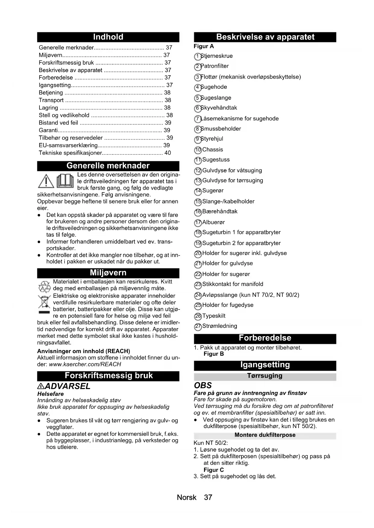 H05VV-F 2x1,0 H05VV-F 2x1,0 H05VV-F 2x1,0 Delnummer (EU) 9.770-933.0 9.770-933.0 9.770-933.0 Kabellængde m 7,5 7,5 7,5Norsk 37 Indhold Generelle merknader Les denne oversettelsen av den origina- le driftsveiledningen før apparatet tas i bruk første gang, og følg de vedlagte sikkerhetsanvisningene. Følg anvisningene. Oppbevar begge heftene til senere bruk eller for annen eier. ● Det kan oppstå skader på apparatet og være til fare for brukeren og andre personer dersom den origina- le driftsveiledningen og sikkerhetsanvisningene ikke tas til følge. ● Informer forhandleren umiddelbart ved ev. trans- portskader. ● Kontroller at det ikke mangler noe tilbehør, og at inn- holdet i pakken er uskadet når du pakker ut. Miljøvern Materialet i emballasjen kan resirkuleres. Kvitt deg med emballasjen på miljøvennlig måte. Elektriske og elektroniske apparater inneholder verdifulle resirkulerbare materialer og ofte deler batterier, batteripakker eller olje. Disse kan utgjø- re en potensiell fare for helse og miljø ved feil bruk eller feil avfallsbehandling. Disse delene er imidler- tid nødvendige for korrekt drift av apparatet. Apparater merket med dette symbolet skal ikke kastes i hushold- ningsavfallet. Anvisninger om innhold (REACH) Aktuell informasjon om stoffene i innholdet finner du un- der: www.kaercher.com/REACH Forskriftsmessig bruk 몇 ADVARSEL Helsefare Innånding av helseskadelig støv Ikke bruk apparatet for oppsuging av helseskadelig støv. ● Sugeren brukes til våt og tørr rengjøring av gulv- og veggflater. ● Dette apparatet er egnet for kommersiell bruk, f.eks. på byggeplasser, i industrianlegg, på verksteder og hos utleiere. Beskrivelse av apparatet Figur A 1 Stjerneskrue 2 Patronfilter 3 Flottør (mekanisk overløpsbeskyttelse) 4 Sugehode 5 Sugeslange 6 Skyvehåndtak 7 Låsemekanisme for sugehode 8 Smussbeholder 9 Styrehjul 10 Chassis 11 Sugestuss 12 Gulvdyse for våtsuging 13 Gulvdyse for tørrsuging 14 Sugerør 15 Slange-/kabelholder 16 Bærehåndtak 17 Albuerør 18 Sugeturbin 1 for apparatbryter 19 Sugeturbin 2 for apparatbryter 20 Holder for sugerør inkl. gulvdyse 21 Holder for gulvdyse 22 Holder for sugerør 23 Stikkontakt for manifold 24 Avløpsslange (kun NT 70/2, NT 90/2) 25 Holder for fugedyse 26 Typeskilt 27 Strømledning Forberedelse
