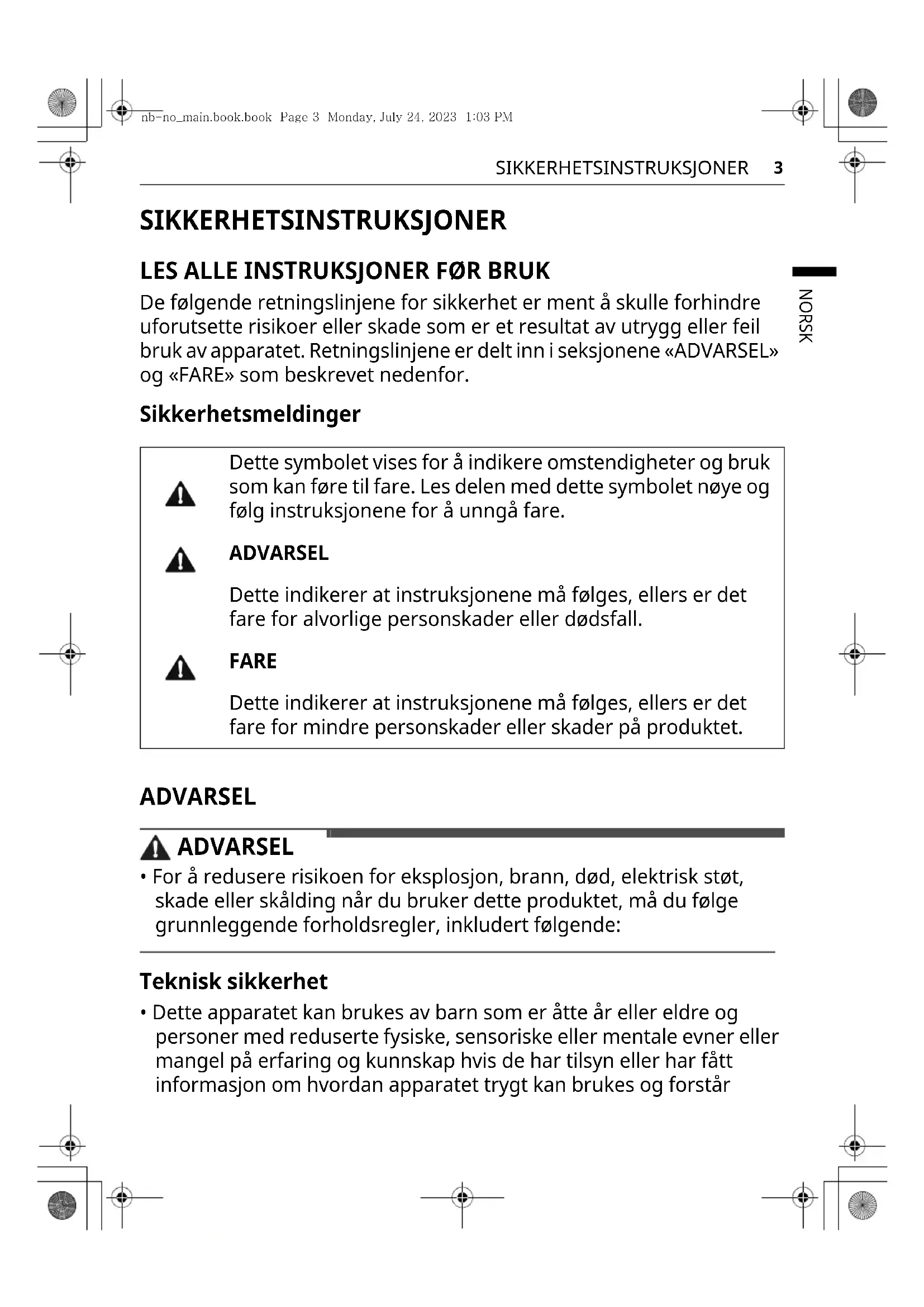 - Dette apparatet kan brukes av barn som er åtte år eller eldre og personer med reduserte fysiske, sensoriske eller mentale evner eller mangel på erfaring og kunnskap hvis de har tilsyn eller har fått informasjon om hvordan apparatet trygt kan brukes og forstår Dette symbolet vises for å indikere omstendigheter og bruk som kan føre til fare. Les delen med dette symbolet nøye og følg instruksjonene for å unngå fare. ADVARSEL Dette indikerer at instruksjonene må følges, ellers er det fare for alvorlige personskader eller dødsfall. FARE Dette indikerer at instruksjonene må følges, ellers er det fare for mindre personskader eller skader på produktet. nb-no_main.book.book Page 3 Monday, July 24, 2023 1:03 PM4 SIKKERHETSINSTRUKSJONER farene dette medfører. Barn må ikke leke med apparatet. Rengjøring og vedlikehold bør ikke utføres av barn uten tilsyn.