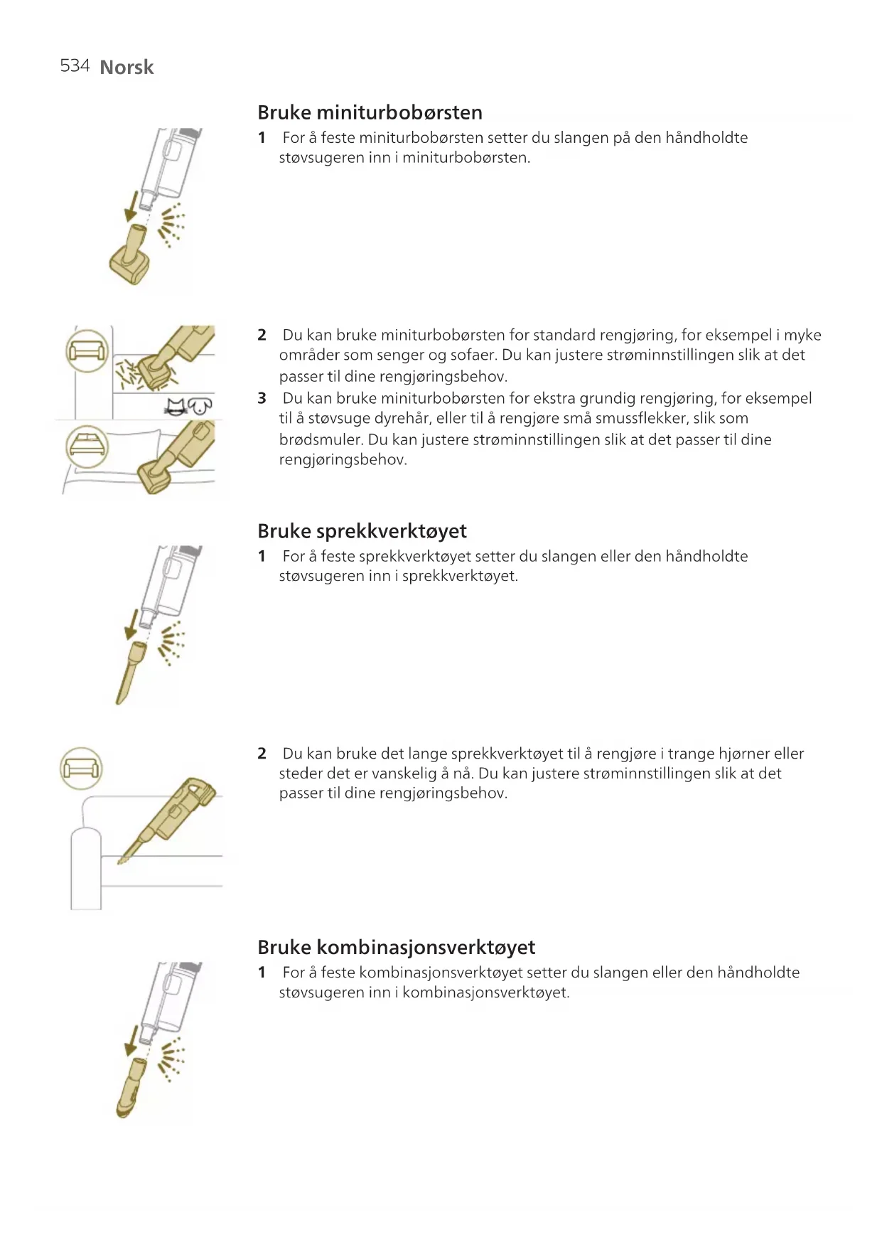 9 Sett den monterte beholderen tilbake på plass. Juster filtersiden av beholderen før du hekter den på plass. Merk: Kontroller etter vedlikehold at filteret er riktig montert i apparatet før det brukes.544 Norsk Vedlikehold av Smart PrecisionPower-munnstykket 1 Slå alltid av apparatet før du rengjør børsterullen på munnstykket. 2 Finn knappen på siden av munnstykket for å komme til børsterullen. Trykk på den og vri for å åpne. 3 Fjern forsiktig børsterullen og sidedekselet på munnstykket. 4 Løs forsiktig eventuelt hår som har viklet seg inn i børsterullen. Bruk saks for å klippe opp hår og fibre. 5 Pass på at børsterullen blir riktig justert ved montering.545 Norsk 6 Fest børsterullen på munnstykket – det høres en "KLIKK"-lyd når den går i inngrep. Vedlikehold av miniturbobørsten 1 Snu børsten for å komme til rengjøringsområdet.