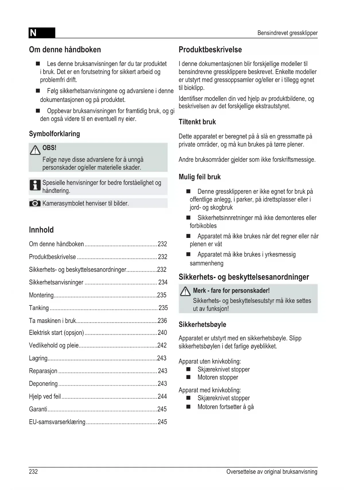 Dette apparatet er beregnet på ä slå en gressmatte på private områder, og på kun brukes på tørre plener.