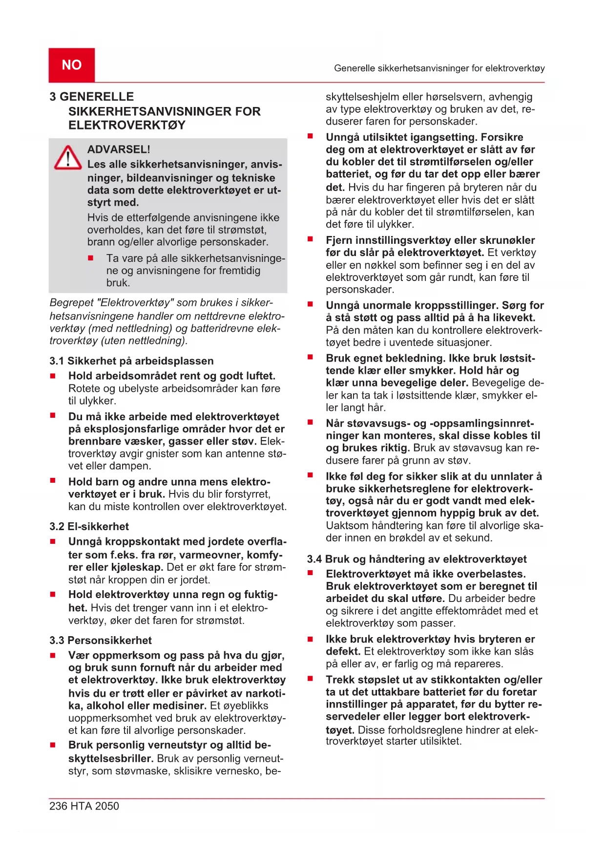 Hold elektroverktøyet bare på de isolerte håndtaksflatene, da skjærekniven kan komme i kontakt med skjulte strømlednin- ger eller tilhørende nettkabel. Hvis skjæ- rekniven kommer i kontakt med en spen- ningsførende ledning, kan apparatdeler i me- tall bli satt under spenning og medføre strøm- støt.NO 238 HTA 2050 Sikkerhet for personer, dyr og eiendom